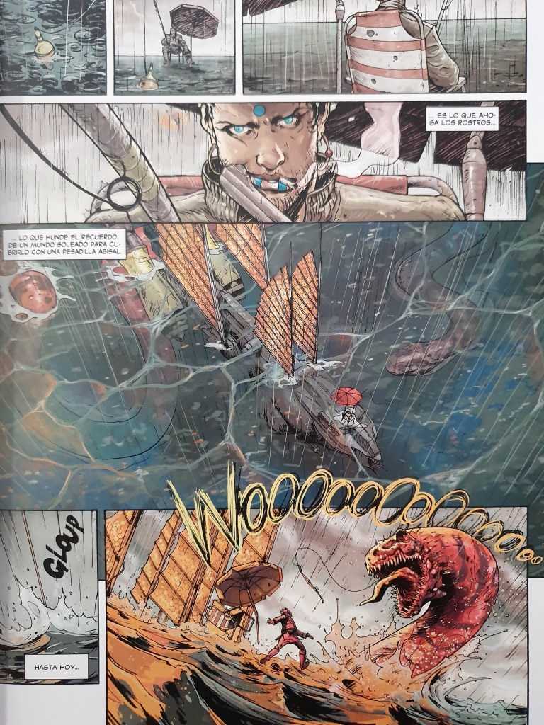 No entanto, a premissa aquática, combinada com a alta tecnologia e a criação de seres geneticamente modificados permite criar cenários fascinantes e detalhados – sem exorbitâncias imaturas, mas poderosas na sua magnitude. Em termos visuais descreveria como único defeito a elevada densidade de quadrados por página – em cenas de maior acção não proporciona a cadência necessária, enquanto que em momentos mais pausados quebra, por vezes, as magníficas paisagens. Apesar do desenho ser excelente, a planificação não me parece perfeita para acompanhar a história em todos os momentos.