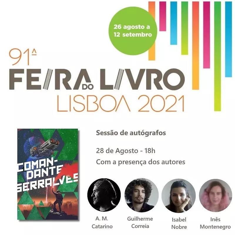 Eventos, Feiras do livro, Ficção Científica Feira do Livro Lisboa – Comandante Serralves – Sessão de Autógrafos Date: Agosto 25, 2021Author: Cristina Alves 0 Comentários Vai decorrer, no dia 28 de Agosto, a sessão de autógrafos de Comandante Serralves, uma edição que reúne várias histórias que decorrem num Universo original de Space Opera! Classifique isto:Partilhar isto: Clique para partilhar no Facebook (Abre numa nova janela) Facebook Carregue aqui para partilhar no Reddit (Abre numa nova janela) Reddit Click to share on X (Abre numa nova janela) X Clique para partilhar no Tumblr (Abre numa nova janela) Tumblr Carregue aqui para enviar por email a um amigo (Abre numa nova janela) E-mail Clique para partilhar no Pinterest (Abre numa nova janela) Pinterest Clique para partilhar no Pocket (Abre numa nova janela) Pocket Gosto Carregando... Relacionado