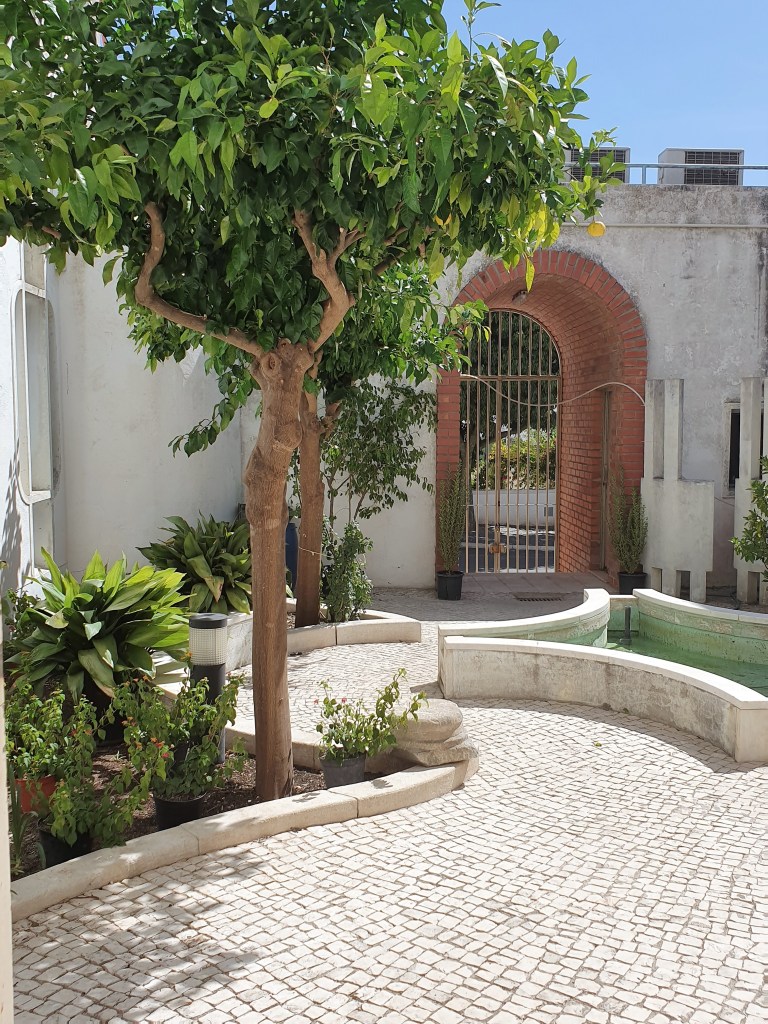 Dentro do edifício podemos encontrar as exposições, ao longo de três pisos, bem como alguns espaços abertos, interiores (como o da foto à esquerda). É num destes que encontramos um café com uma pequena esplanada.