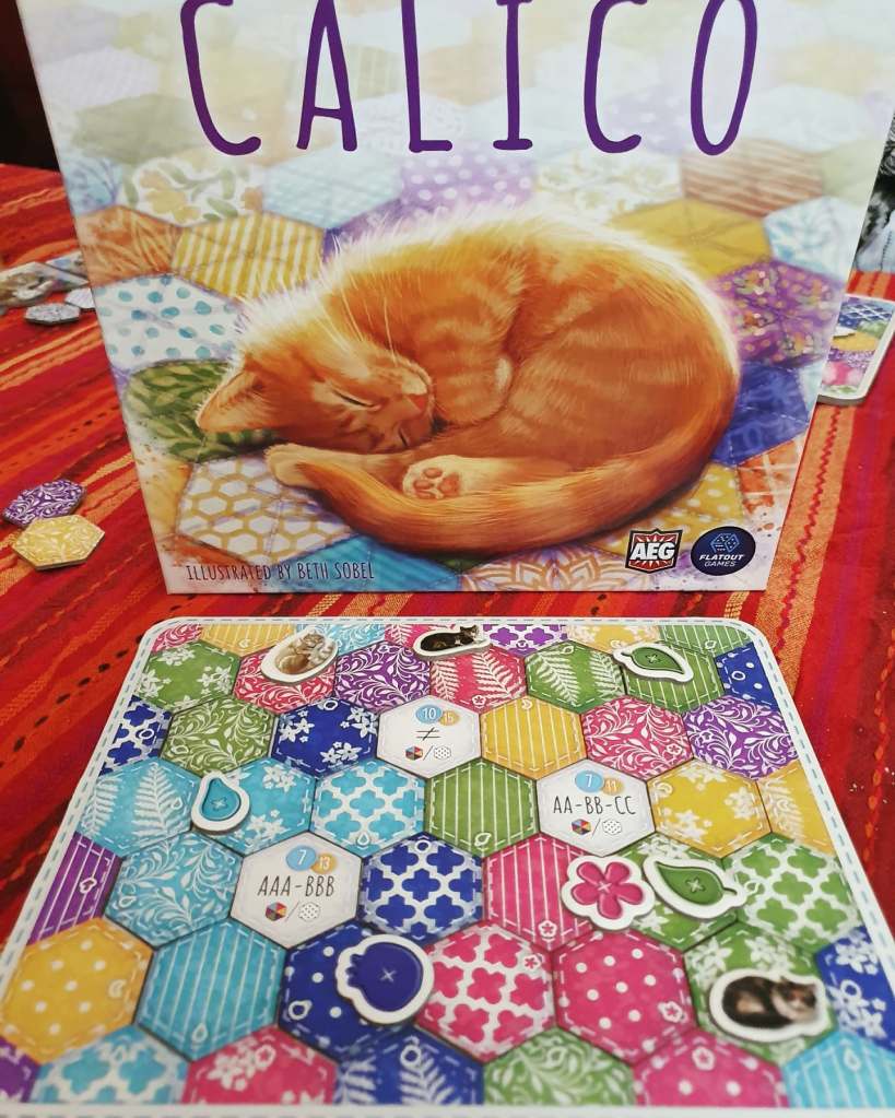 Gatos numa manta de retalhos – Calico é um abstracto visualmente atraente onde cada um dos jogadores tenta fazer uma manta de retalhos, cumprindo objectivos com as peças que agrupa. Para além dos objectivos que se encontram nos tabuleiros, grupos de determinados padrões ou de cores proporcionam pontos extra. Os tipos de grupos e de combinações a realizar podem ir mudando de jogo para jogo, adicionando alguma diversidade ao jogo.