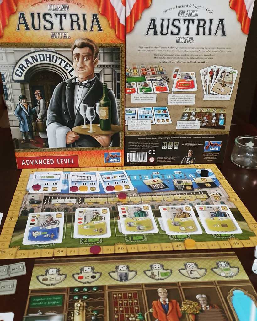Jogos com dados costumavam ser um tabu cá em casa, mas depois de descobrirmos Castles of Burgundy, temos experimentado alguns onde os dados são usados. É o caso de Grand Austria Hotel, um jogo onde se gerem os clientes de um hotel que combina mecanismos como leilão com gestão de mão e cumprimento de contractos. A experiência de jogo é sempre positiva e animada.