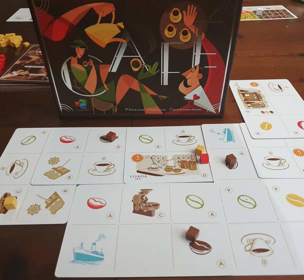 Para mim, um dos melhores jogos portugueses lançados nos últimos tempos, Café tem, como principal defeito, acabar cedo demais. De resto, o visual é impecável e as cartas são simples mas de imagens perceptíveis. É um jogo simples e acessível que gostaria que tivesse maior destaque.