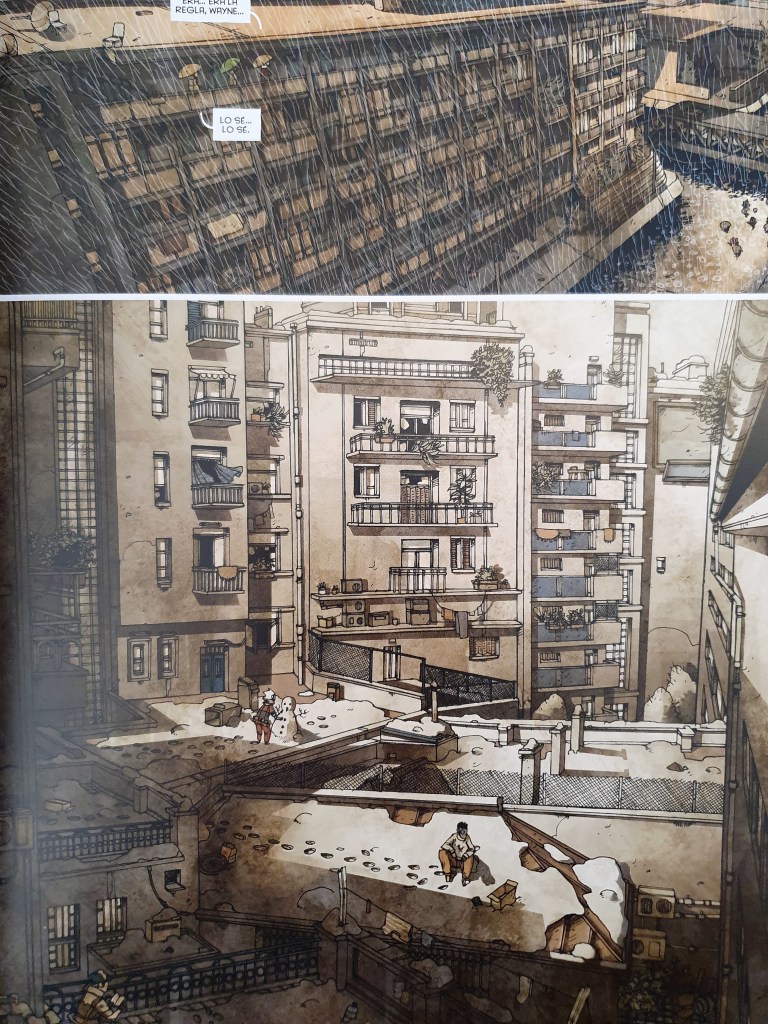 Normalmente começo pela narrativa, mas neste caso vou começar pelo desenho. Como tinha indicado antes, o estilo de desenho que se encontra na capa é o encontramos nas páginas interiores. A acção decorre toda no espaço urbano, havendo várias imagens em que se aproveita o contexto apocalíptico da cidade, apresentando páginas em que se usa uma só cor, predominantemente o castanho avermelhado, ou um azul esverdeado.