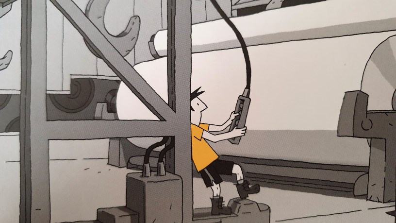 A narrativa centra-se fundamentalmente em três vectores: as tarefas que realiza na fábrica (e o que vai aprendendo), as interacções com outros trabalhadores, e a sombra do pai naquela fábrica. Este terceiro vector é mais subtil e leve, ocupando um pouco mais de espaço na narrativa do que o número de páginas deixa percepcionar – o pai é uma figura distante e solitária, apesar de bem disposta que tenta comunicar com Guy.