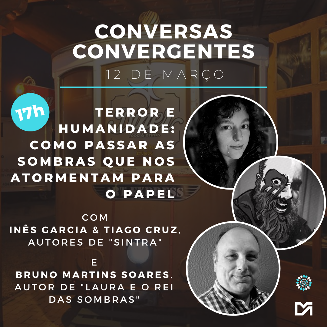 «Terror e Humanidade: Como passar as sombras que nos atormentam para o papel», com Inês Garcia e Tiago Cruz, autores de Sintra (Escorpião Azul); e Bruno Martins Soares, autor de Laura e o Rei das Sombras (Editorial Divergência).