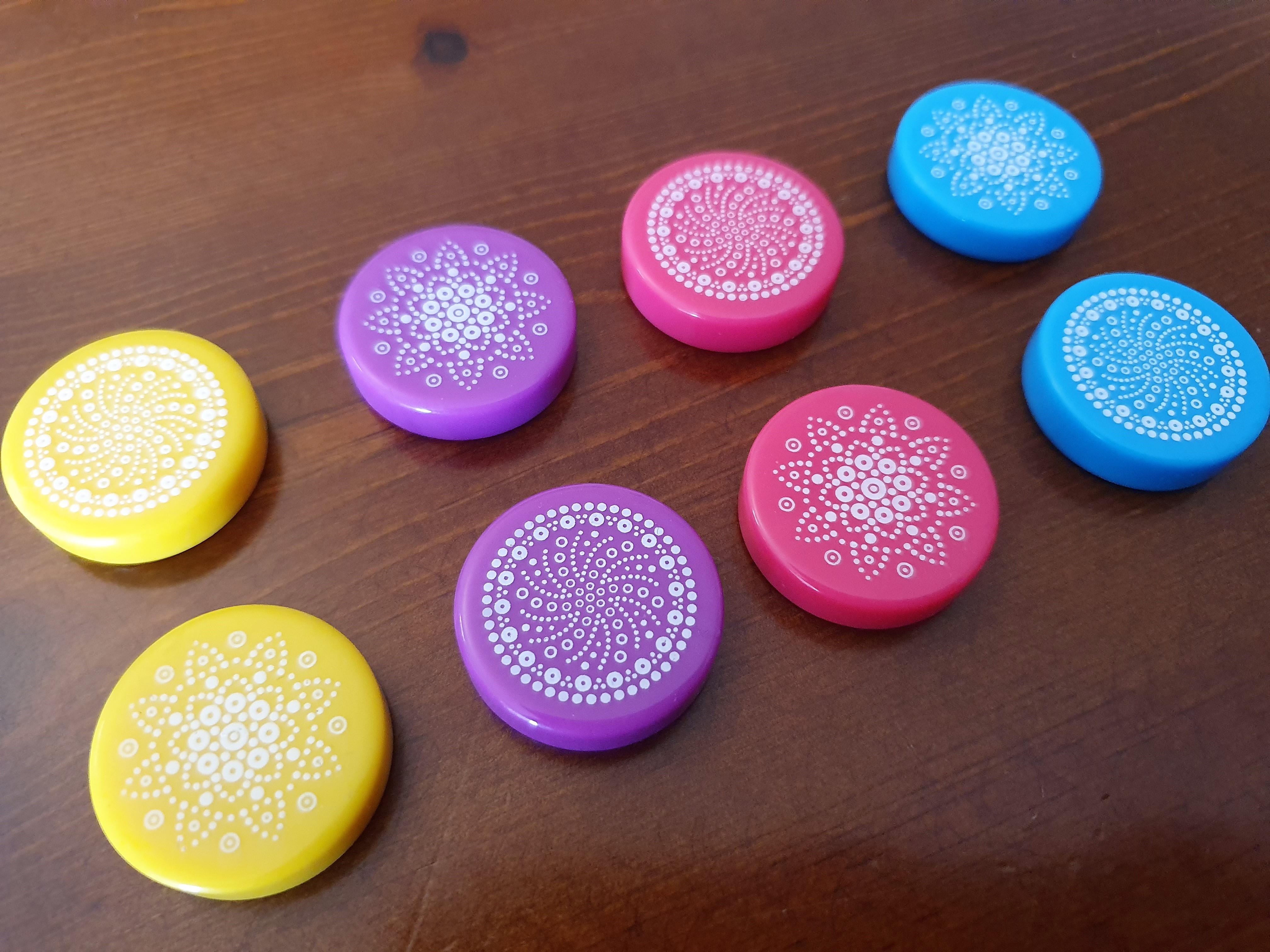 As peças circulares e coloridas são compostas por um material pesado (ao estilo de Azul) e são agradáveis quer em visual, quer ao toque. As peças encontram-se disponíveis em quatro cores diferentes e têm desenhadas uma de duas possíveis mandalas. As duas mandalas são suficientemente diferentes para serem distinguíveis. O único defeito será o desenho a branco nas peças amarelas que é mais difícil de percepcionar.