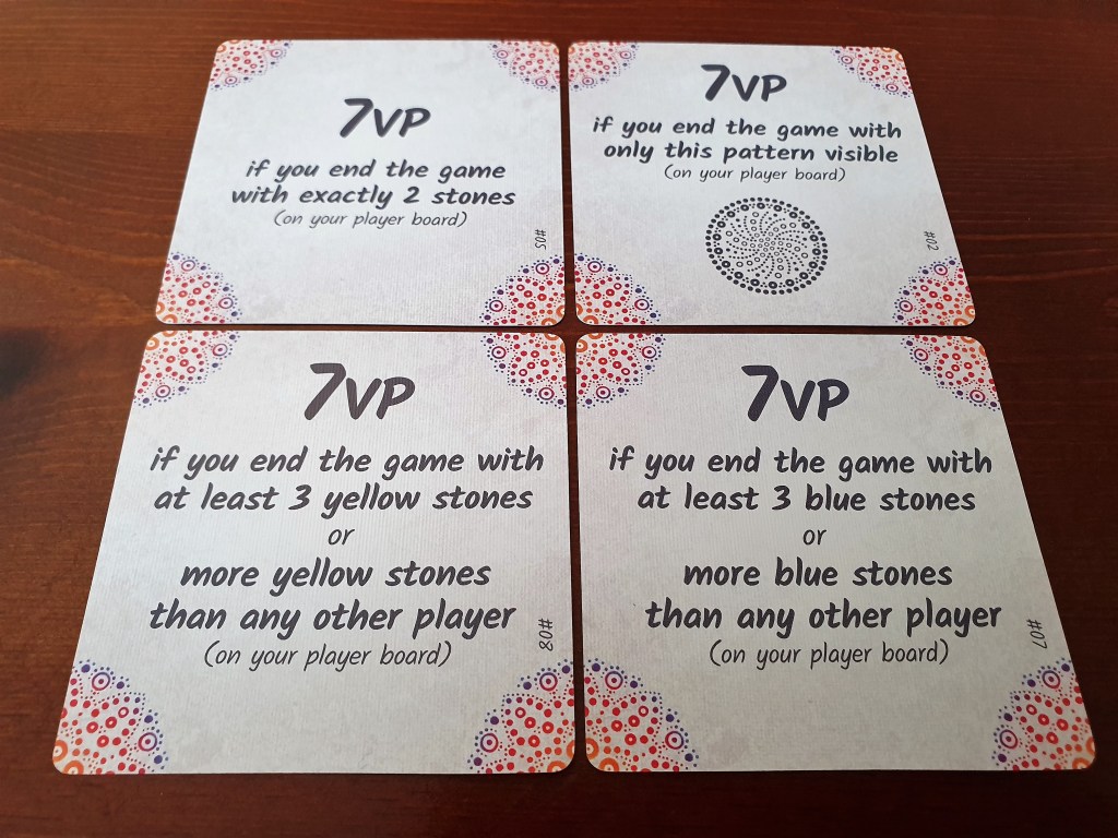 Para além de se pontuar pelos objectivos e pela peças colocadas em espiral, existem ainda objectivos privados que são distribuídos pelos jogadores.