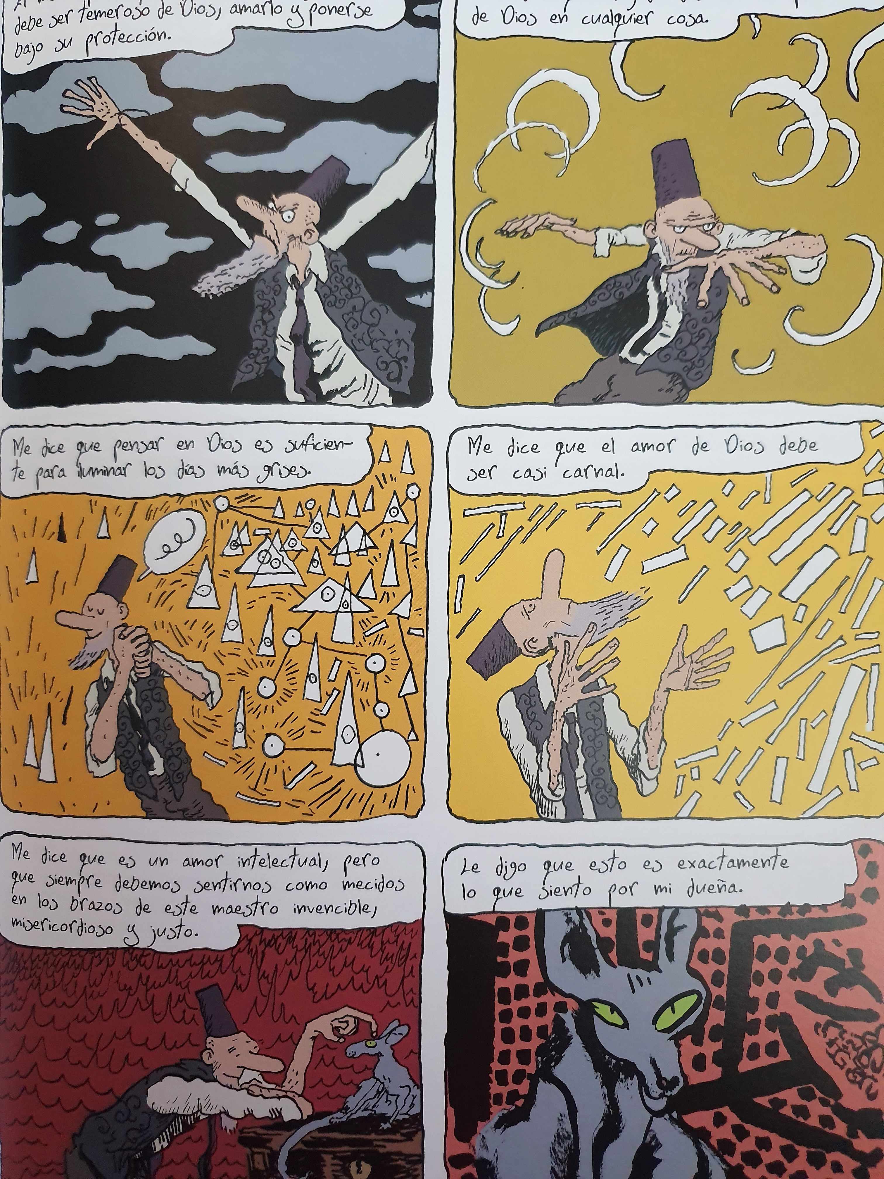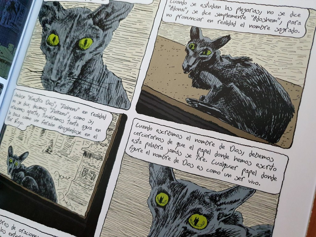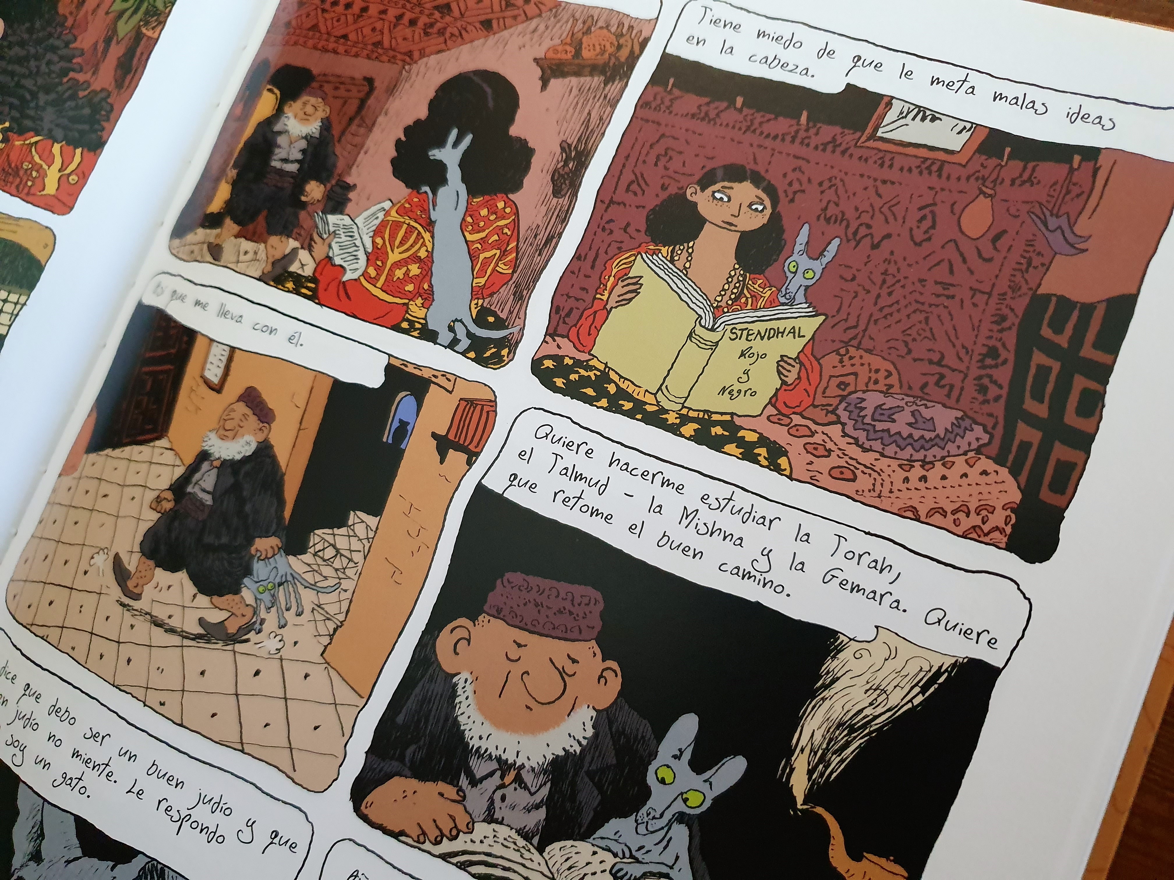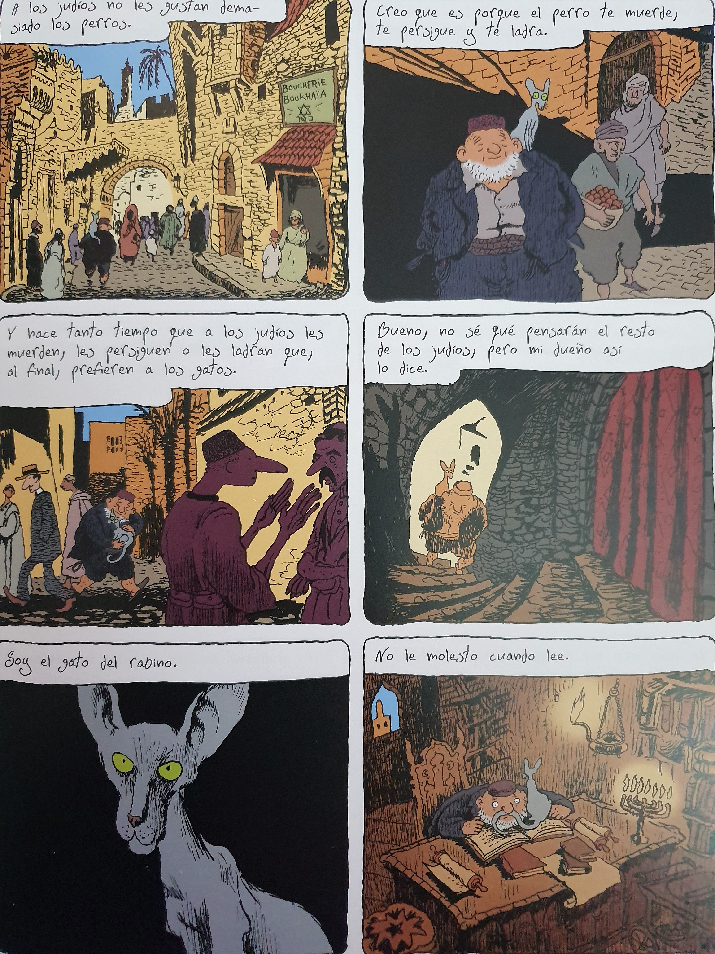 O Gato do Rabino fala. Mas as ideias que expressa são pouco religiosas e as questões que faz despertam dúvidas que poderão fazer duvidar os mais fracos. É, dessa forma, proibido de falar com a filha do rabino – não vá falar demasiado.