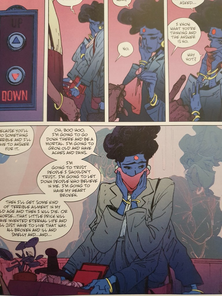 Nalguns pontos esta história recorda-me Sandman de Neil Gaiman. A mais óbvia será a personificação da Morte numa jovem mulher problemática. Ainda que visualmente bastante diferentes, este terá sido um dos pontos de associação mais óbvios. Outro ponto é a aparente imaterialidade, uma leveza narrativa que apresenta episódios sem uma cadência fixa dispersos na vida das personagens. Claro que em confronto com uma entidade como a Morte, surge, tal como em Sandman, a fragilidade da vida humana perante a velocidade do Universo.