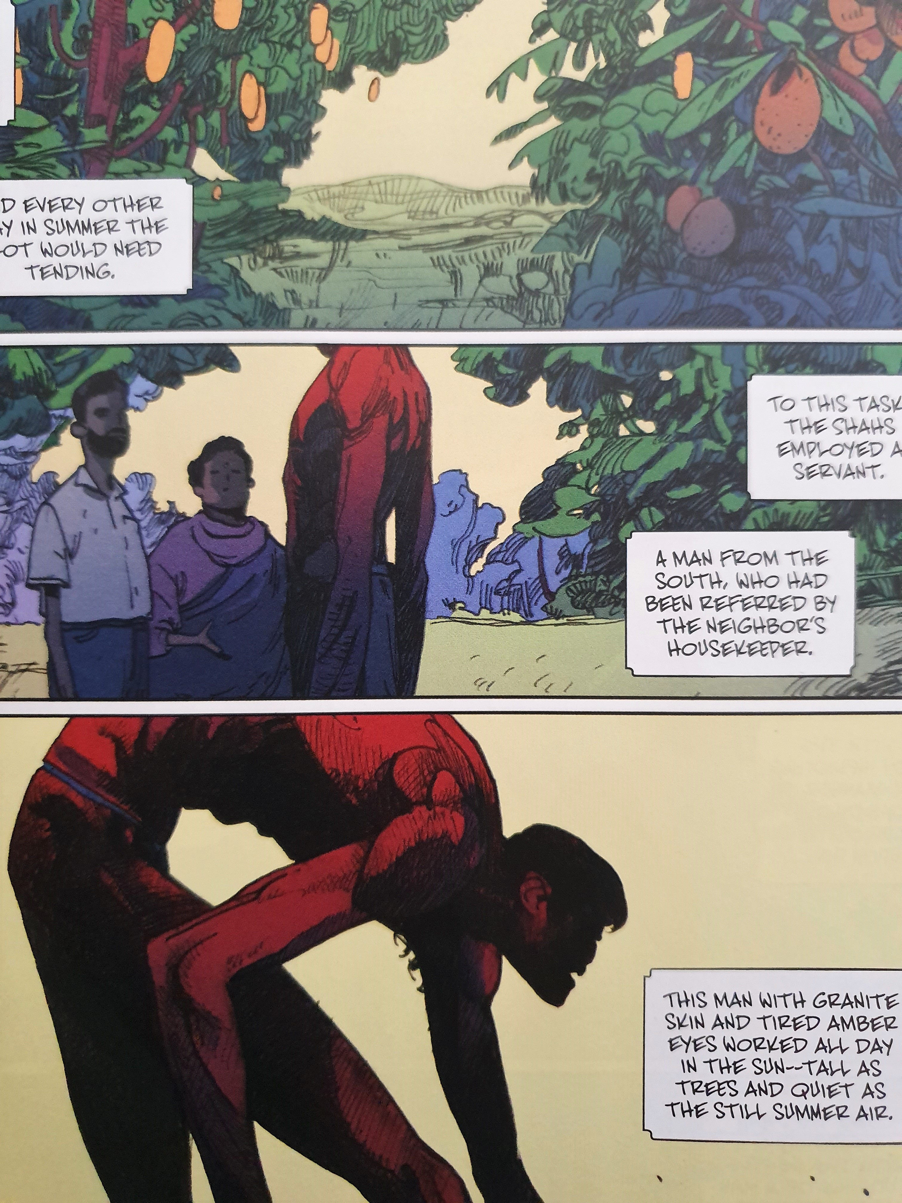 Em termos visuais é um livro que se distingue pelas cores fortes e contrastantes, alusivas ao ambiente cultural em que decorre a história. Existe um grande foco visual nas feições das personagens, principalmente enquanto decorrem as conversas mais marcantes, demarcando os sentimentos que vão surgindo. Destaca-se também bastante, o posicionamento das mãos, um foco com elevada recorrência.