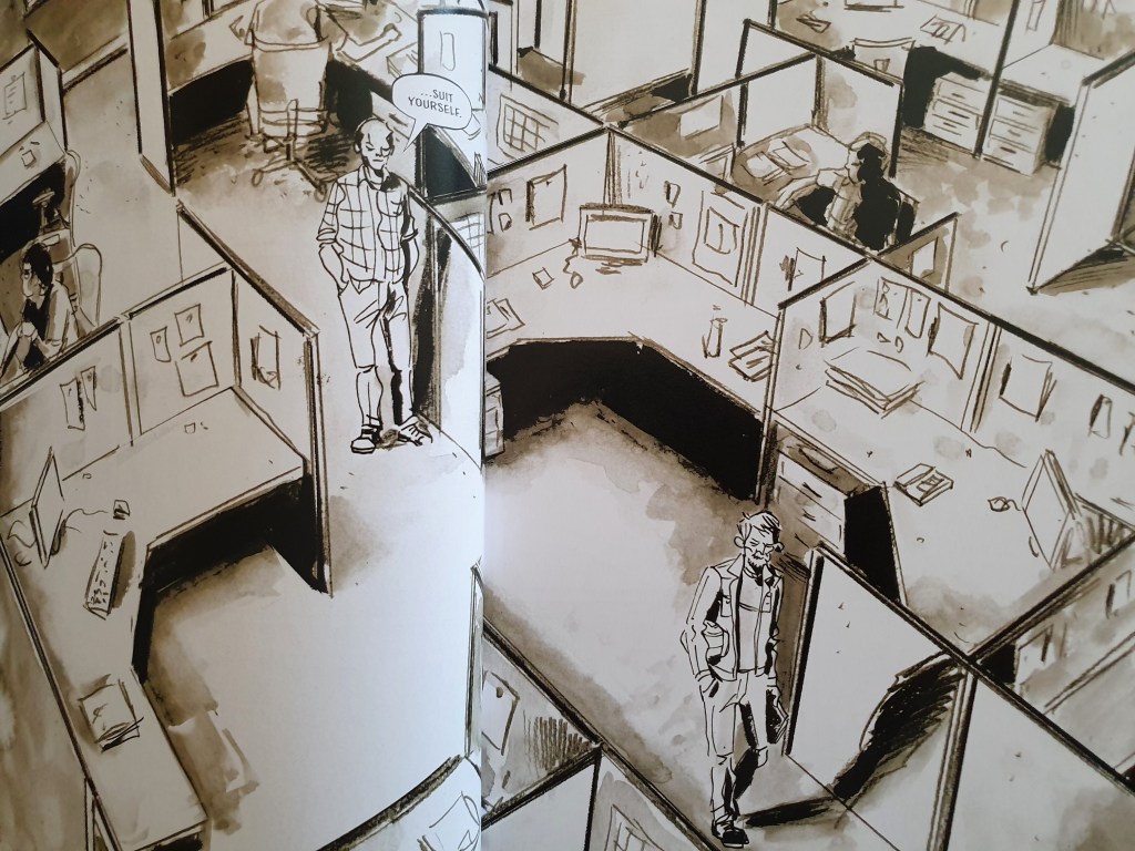 Em termos visuais, encontramos o tal estilo relaxado do autor – as feições são rudes, os contornos das personagens são toscos. Ainda assim, alguns jogos visuais e enquadramentos são curiosos, conferindo tensão ou reflectindo a confusão mental da personagem. Apesar de não gostar do estilo visual quando analiso friamente as páginas, na progressão da história, a sensação é-me totalmente diferente.