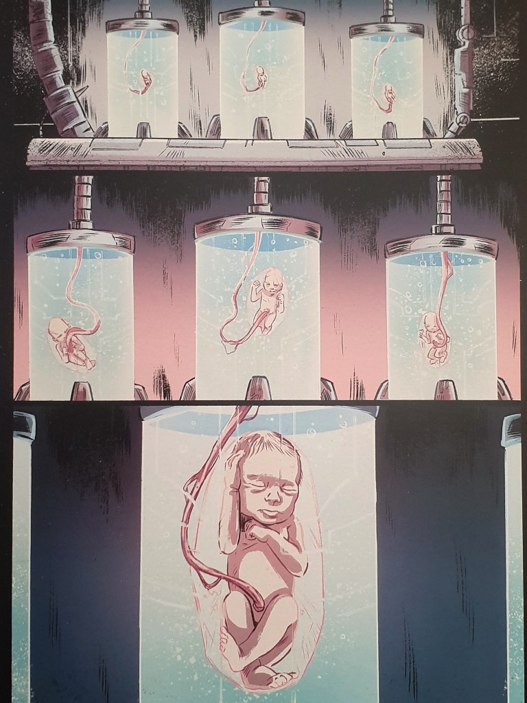 A ideia central permite, claro, explorar vários pontos da ficção científica como a relação homem-máquina, neste caso em dois sentidos. Por um lado, temos a criação de humanos por inteligências artificiais que assumem o papel de progenitor. Por outro, temos uma personagem com membros metálicos que lhe irão permitir ultrapassar a usual resistência humana.