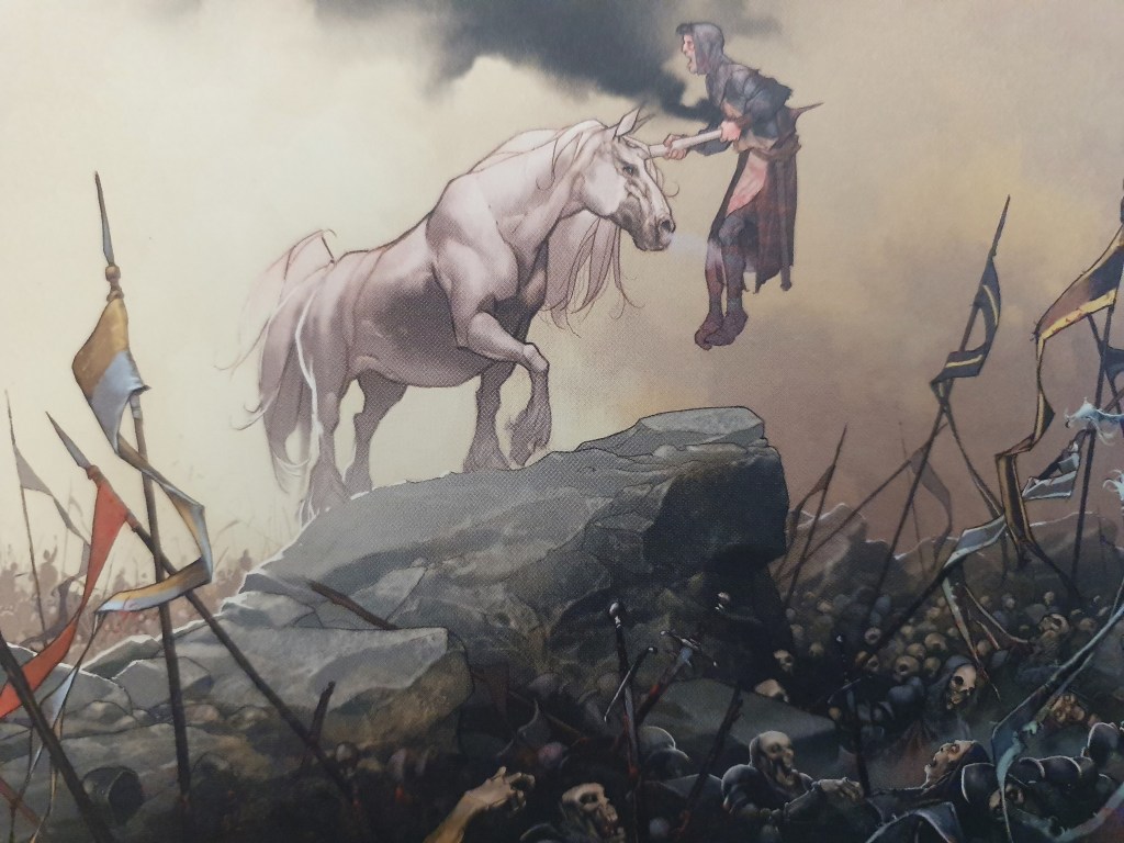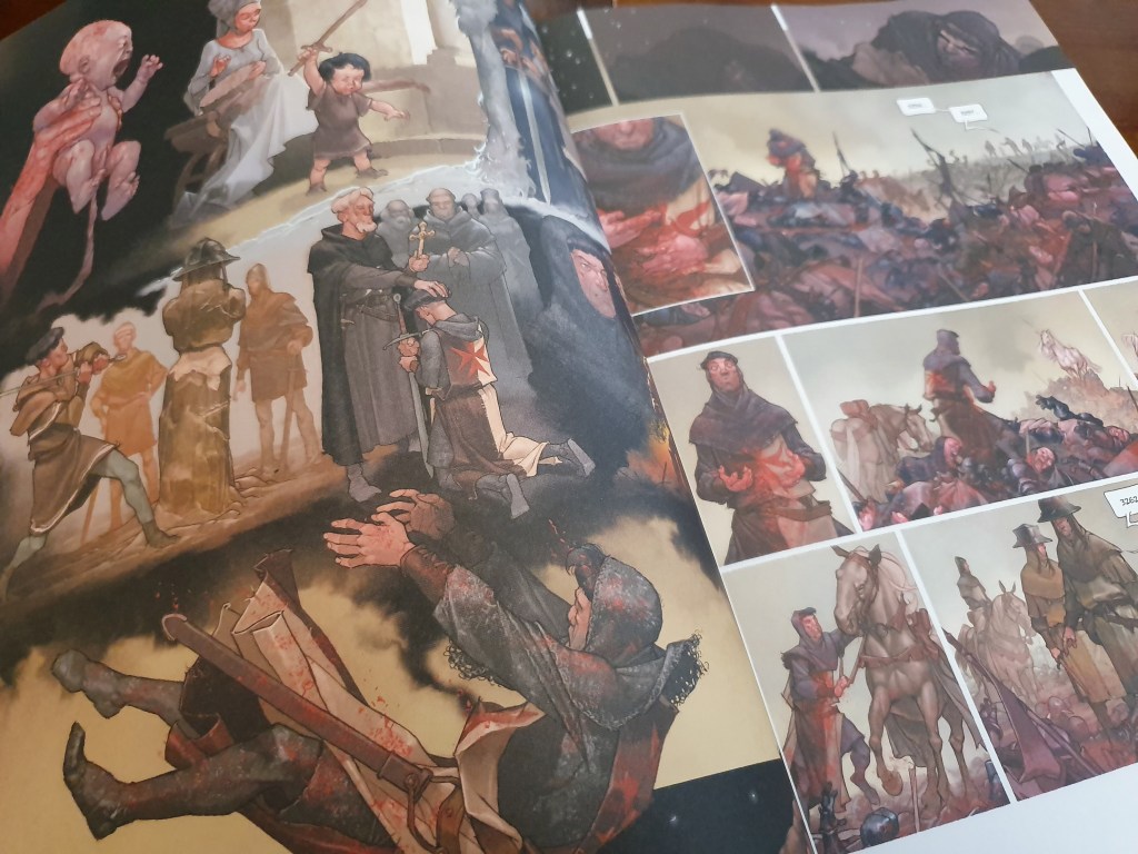 O Cavaleiro do Unicórnio é um livro que me surpreendeu sobretudo do ponto de vista visual. A história em si não tem grande complexidade ou elementos originais, apresentando um homem, que, após a batalha, parece ter momentos de loucura. Mas nesta premissa narrativa relativamente simples, os desenhos criados são muito bons, quer na forma como as imagens se sucedem e se expõem, quer isoladamente pelos detalhes e coloração que apresentam. Visualmente é um volume brutal.
