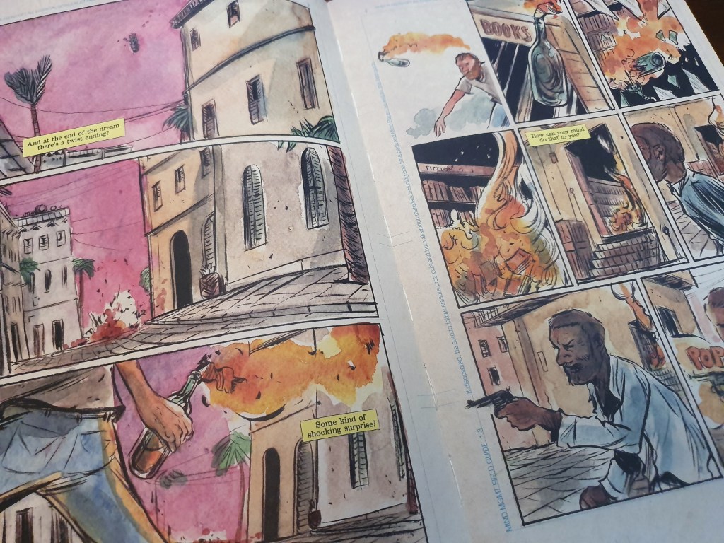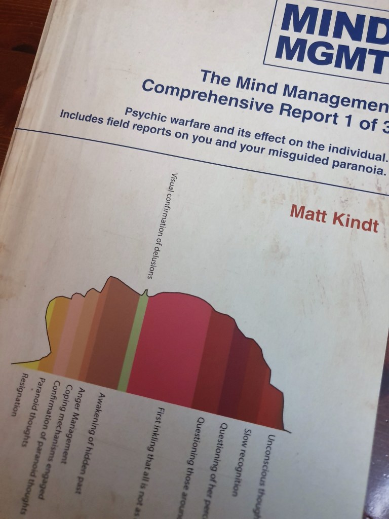 Mind MGMT não é fácil de entrar. A narrativa apresenta detalhes sucessivos como um puzzle que se vai construindo página a página e ainda que existam episódios de acção constantes, com fugas, perseguições e mortes, de alguma forma, esta acção não se traduz numa cadência narrativa elevada e senti que a progressão era lenta. Felizmente, após algumas páginas, a leitura cativa pelo mistério crescente, ao qual se vão adicionando detalhes – e conforme se avança na leitura, mais embrenhado fica o leitor.