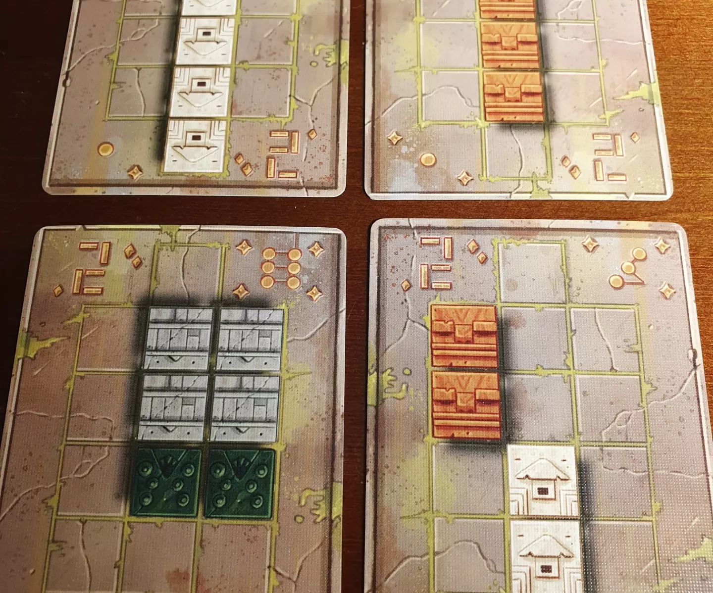 Para além do tabuleiro, as peças também são um componente interessante. Por um lado, são bastante pesadas, o que permite estabilizar o tabuleiro superior. Por outro, possuem quadrados bem destacados, o que permite uma visualização mais clara dos padrões. As cartas de objectivo são visualmente agradáveis, com a grossura necessária, mas sem acabamentos especiais.