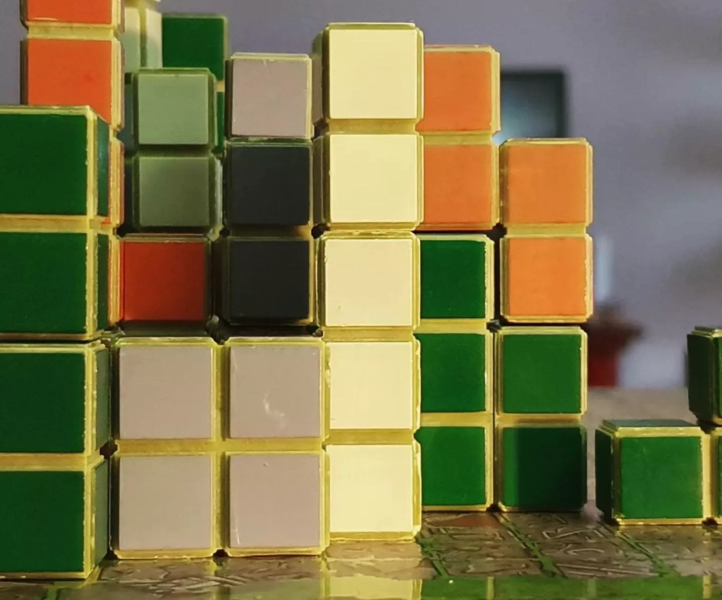 Claro que o outro elemento é a tridimensionalidade. O tabuleiro a dois níveis permite que a colocação das peças seja feita próximo do nível dos olhos do jogador, e é nessa perspectiva que vai validar a execução de padrões para concretizar objectivos. Como as peças podem ser colocadas em diferentes profundidades, a sua colocação vai afectar, de forma diferente a visualização dos restantes jogadores.