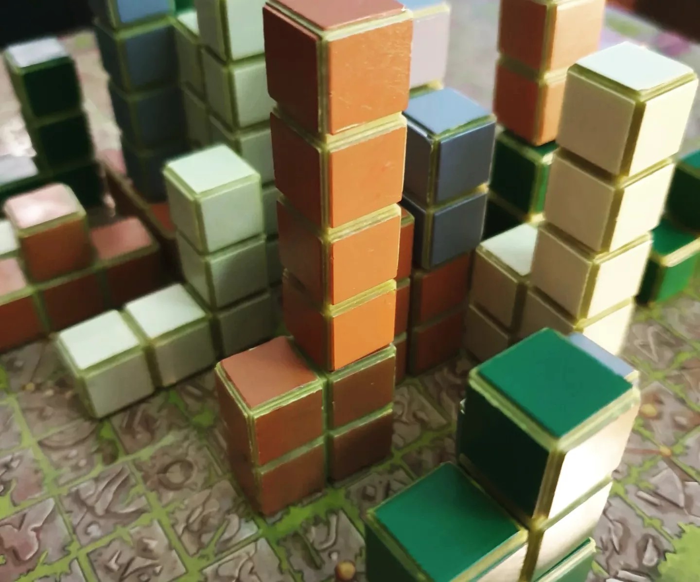 Diria que duas coisas: a simplicidade ou fluidez das jogadas, e a tridimensionalidade. Em termos de simplicidade, o jogador tem na mão quatro cartas de objectivo que, embora possam ser de complexidade diferente, são da mesma tipologia, ou seja, são concretizadas pela existência de um padrão no tabuleiro. Para além disso, cada jogador possui uma carta privada para pontar no final do jogo e que está associada à visualização de quadrados de uma determinada cor.