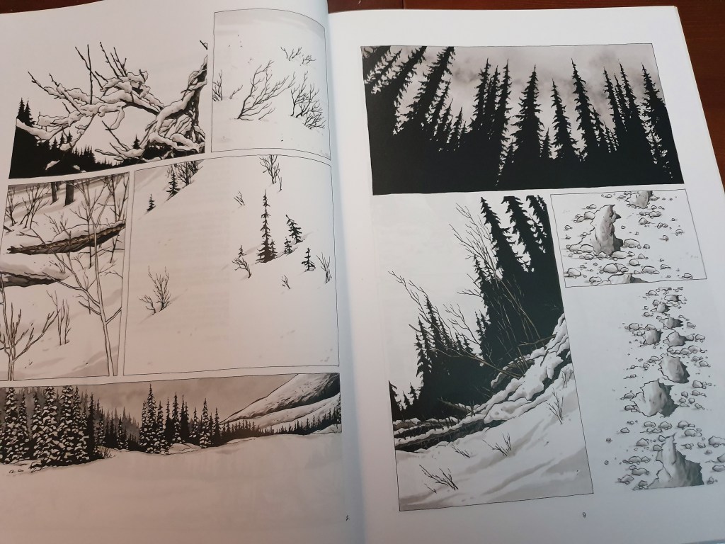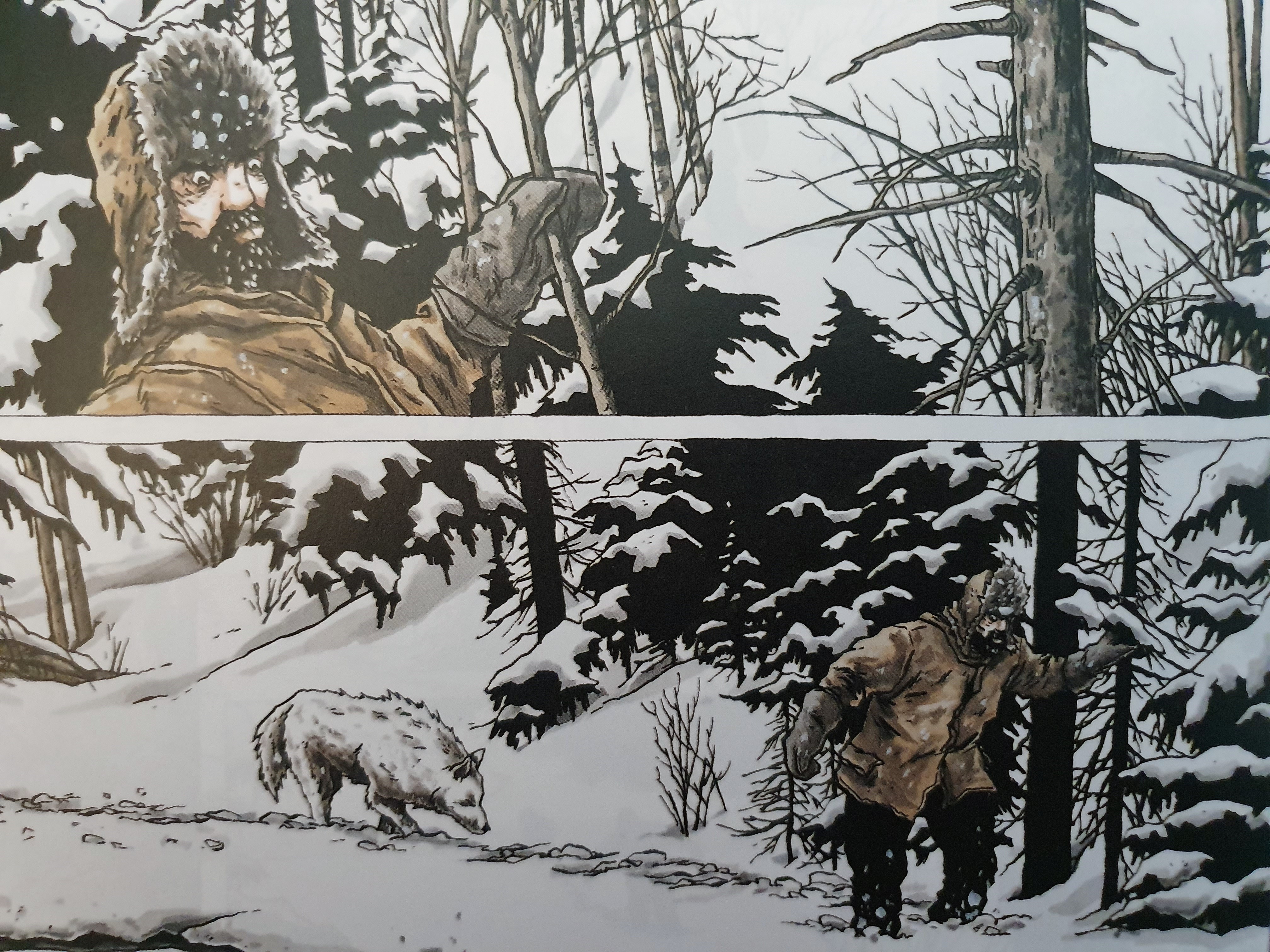 A paisagem é deserta, reflectida aqui por paisagens brancas, cortadas pelos ocasionais pinheiros. O foco dos quadrados, quando não nos mostra a paisagem, está no homem, focando-se na progressão do seu estado e nas feições, cada vez mais carregadas, que vão perdendo a ligeireza inicial.