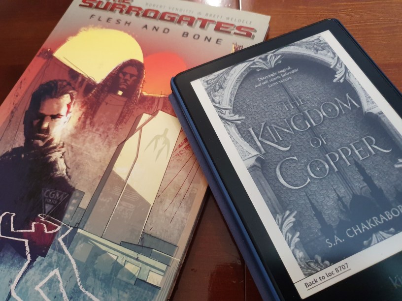 61-63 – The Daevabad Trilogy – S. A. Chakraborty – Nesta trilogia acompanhamos Nahri, uma mulher órfã que aprendeu a desenrascar-se nas ruas do Cairo e que sobrevive entre as subtilezas de charlatã e a capacidade de ver a doença nos que a visitam. Quando, durante uma cerimónia, resolve falar na sua língua natal para causar um efeito mais exótico, desperta uma força desconhecida que a persegue para matar. Em seu auxílio vem um antigo guerreiro djinn, que a irá levar para a cidade Daevabad, uma cidade escondida dos humanos onde encontramos várias criaturas sobrenaturais. Nahri será mais uma delas, a descendência perdida de uma curandeira poderosa, que terá de encontrar o seu lugar entre traições e boas intenções;