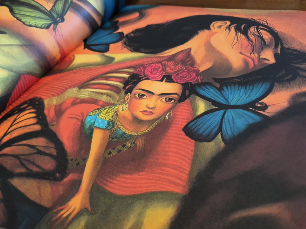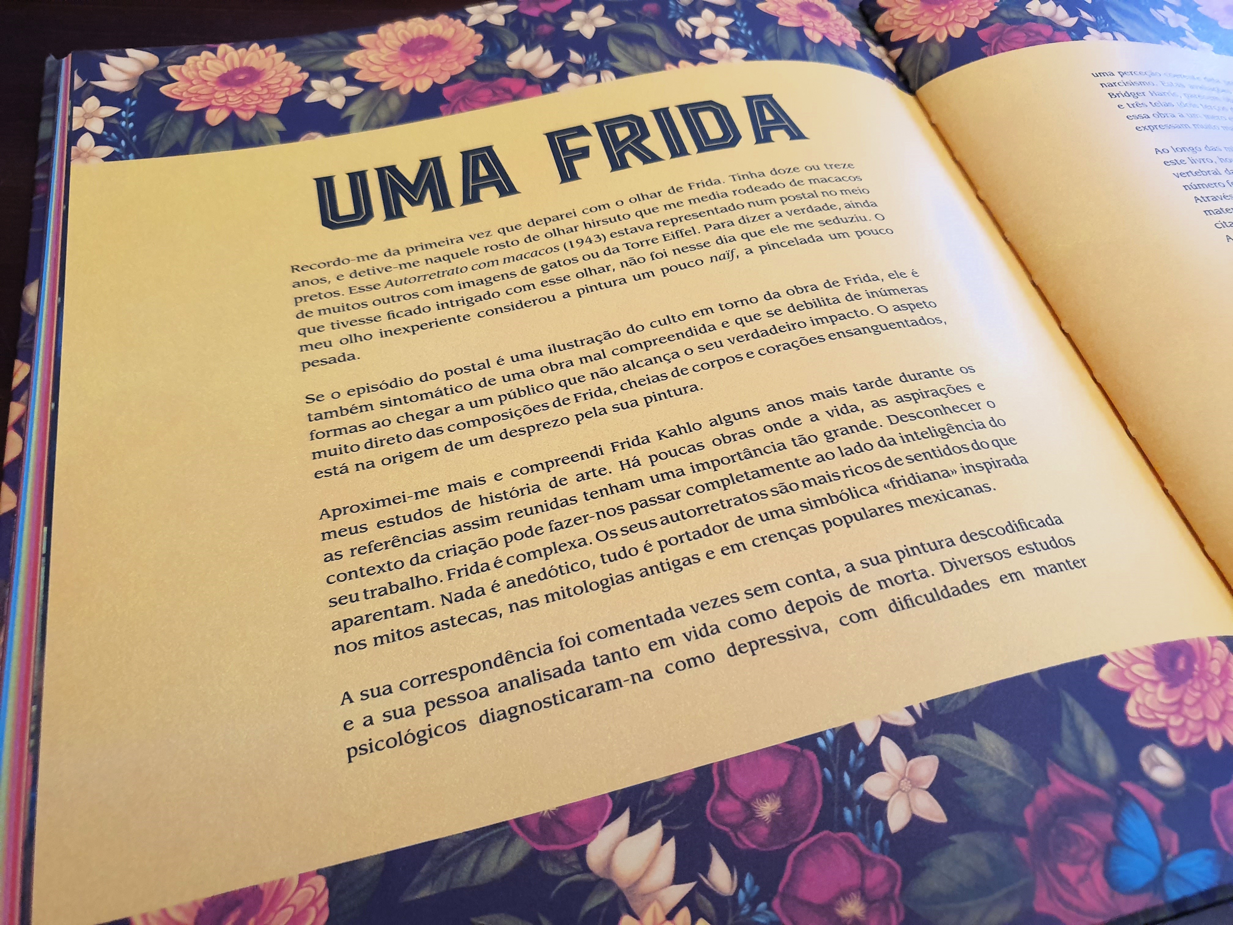 Primeiro volume de uma colecção de Arte lançada pela editora Kalandraka, este Frida destaca-se por ser uma edição de luxo. O livro vem fechado num pacote especial de plástico e só após a sua retirada percebemos a textura especial da capa. As folhas de guarda apresentam um motivo alusivo à artista e à cultura mexicana, e no interior as folhas grossas apresentam recortes que irão possibilitar uma outra visão da arte que se apresenta.