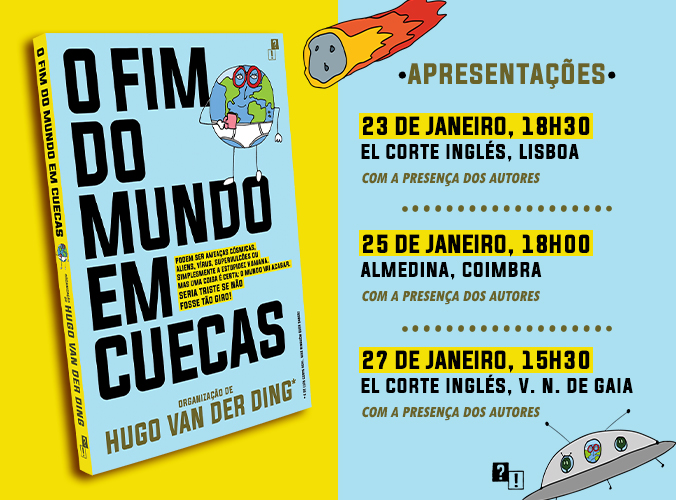 Uma das melhores leituras de 2023, O Fim do Mundo em Cuecas, vai ter evento de lançamento em três cidades, Lisboa, Coimbra e Vila Nova de Gaia, com a presença de autores. O livro, organizado por Hugo Van Der Ding e Luís Corte Real, apresenta vários textos de cientistas, escritores e jornalistas que pegam num fim do mundo possível e o desenvolvem – por vezes recorrendo apenas a factos científicos, por outras como uma história de ficção científica.
