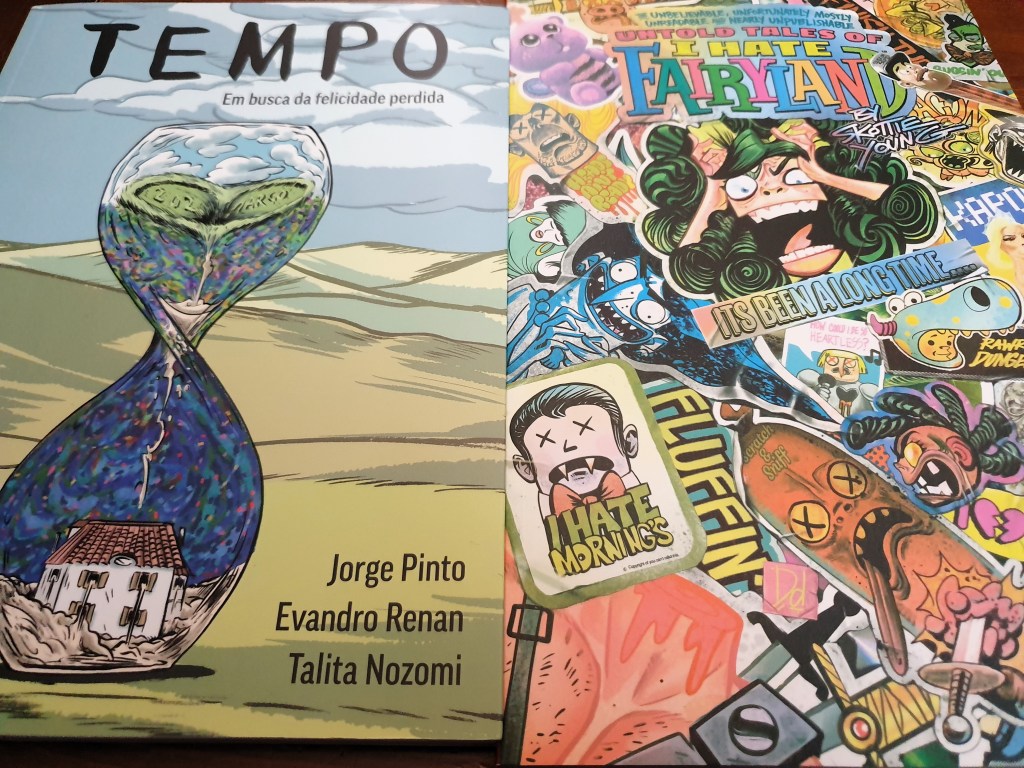 Tempo é o novo livro de Jorge Pinto o autor de Amadeo: A vida e obra entre Amarante e Paris, lançado no mercado português pela Iguana. A sinopse promete, bem como o desenho. Veremos o que entrega, mas as expectativas são elevadas. O volume da direita foi encomendado, se a memória não me falha, em Novembro. Trata-se de um volume de pequenas histórias que decorrem no Universo de I Hate Fairyland, cada uma com a participação de um desenhador diferente.