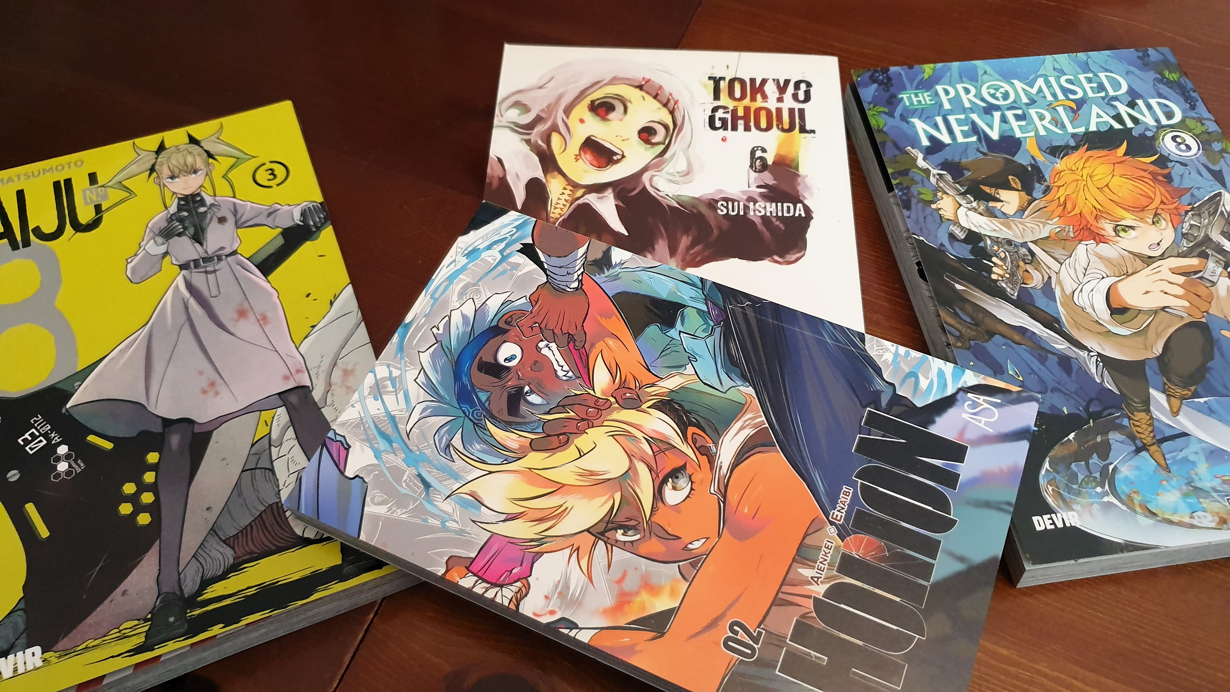 Alguns dos livros que chegaram são os próximos volumes das séries Mangá que leio. The Promised Neverland já me conquistou e cada vez que chega um livro, corro a lê-lo. De tal forma que claro que já li este oitavo e não me desapontou. O terceiro volume de Kaijo N.º 8 permitiu continuar a história, e efectivamente tomou um tom mais interessante. A série ainda não me convenceu totalmente e estou sempre na dúvida se a irei continuar. Já Tokyo Ghoul tomou um rumo curioso e tenho aproveitado para comprar os próximos volumes em leilão. Com este segundo volume de Horion devo tomar uma decisão quanto a continuar a série.