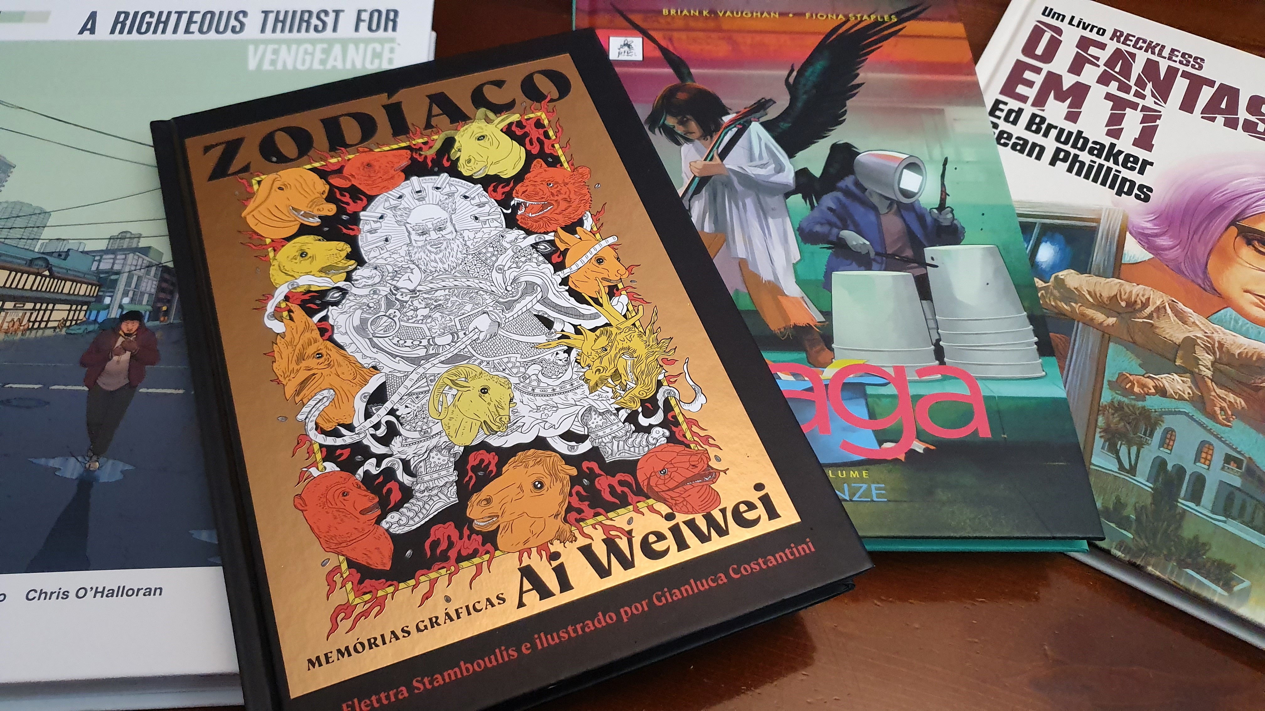 O último livro deste conjunto foi uma boa surpresa. Confesso que não sabia muito bem o que ia encontrar em Zodiaco, mas o volume aproveita os signos chineses para cruzar contos tradicionais com factos decorridos na China, demonstrando o clima político e social, sobretudo para com os artistas.