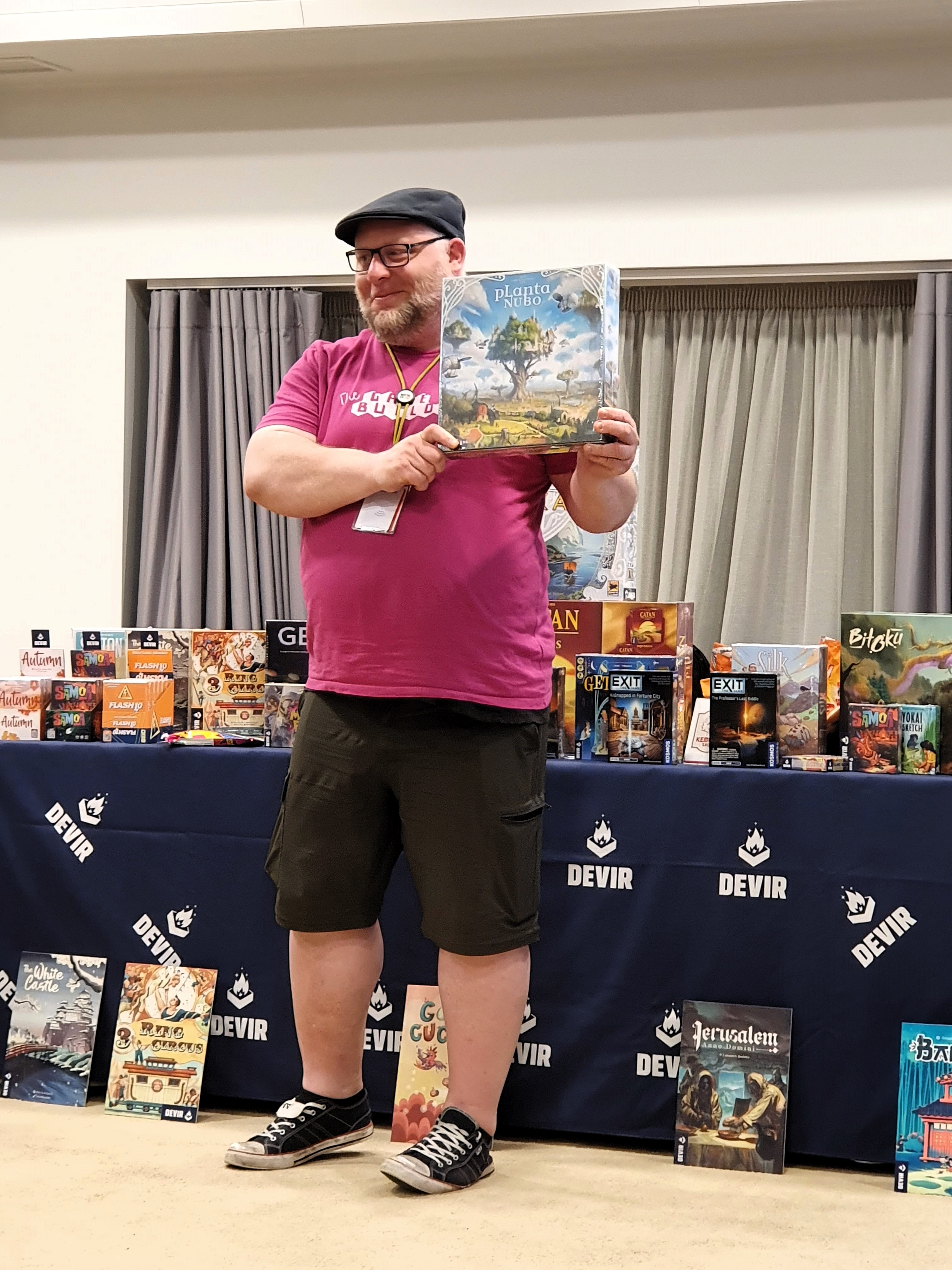 A terceira presença foi a de Andreas “ode” Odendahl, um dos autores de Planta Nubo, um jogo que já me tinha chamado à atenção (tanto pela co-autoria de Uwe Rosenberg, como pelo tema Solarpunk, género de ficção científica cada vez mais em voga, que opta por apresentar futuros mais positivos e eco-sustentáveis). Existirá, no mesmo Universo do jogo, uma antologia, mas apenas no idioma Alemão.