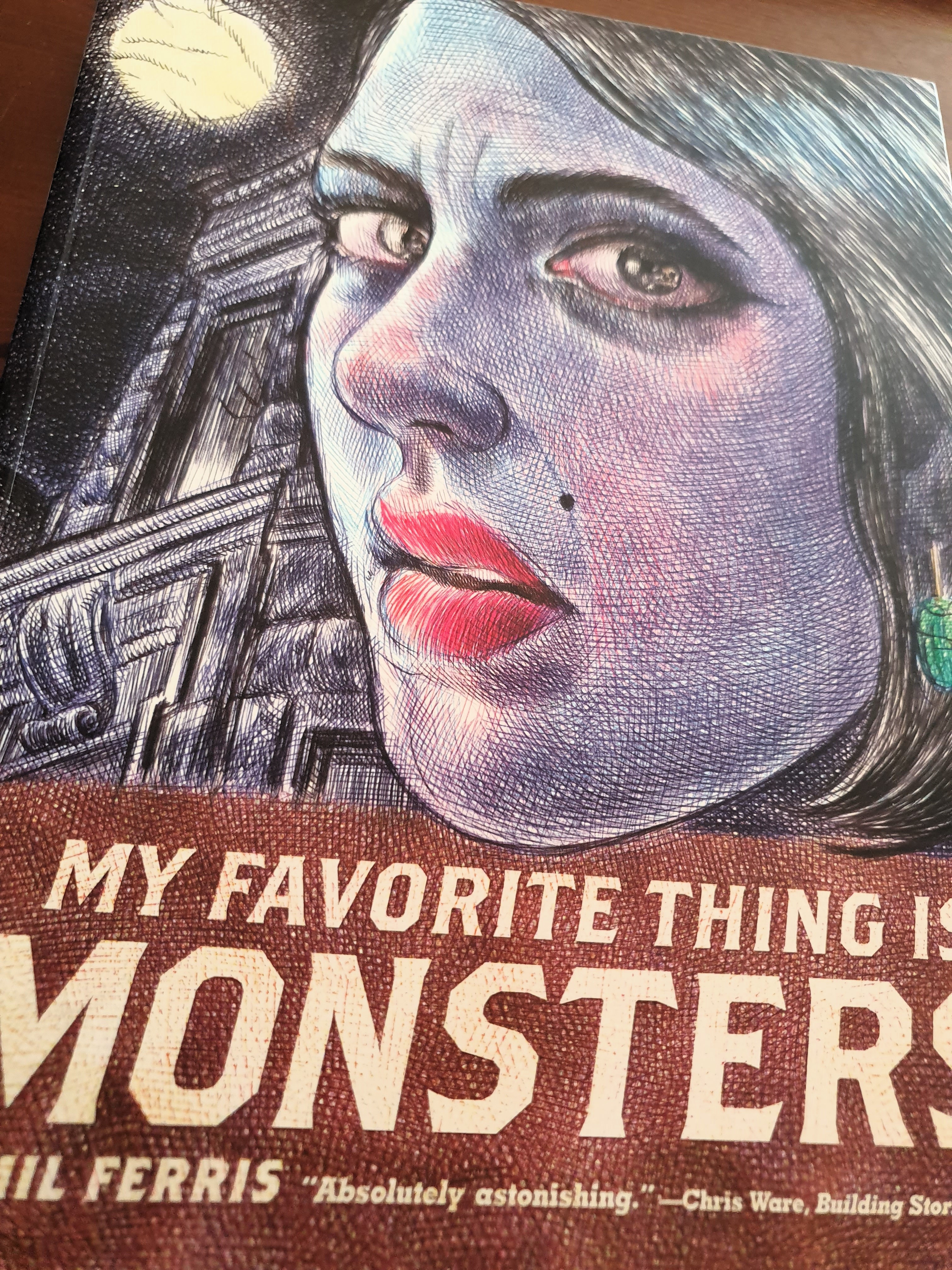 Este primeiro livro de My Favorite Thing is Monsters está escrito como uma espécie de diário criado por uma criança de 10 anos, alternando letra manuscrita, com o que parecem colagens e desenhos, não só das acções da personagem, mas também dos monstros que imagina e sobre os quais lê nas revistas pulp. O resultado é uma mistura diferente e original, por vezes excessiva mas cativante, noutras com páginas brutais e originais.