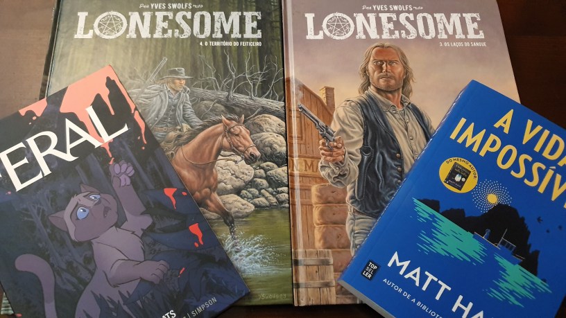 262 / 263 – Lonesome – Vol. 3 e 4 – Yves Swolfs – A história já tinha tomado um caminho bastante diferente de histórias western tradicionais no segundo volume, e prossegue nesta linha, entre elementos que encontramos no Oeste como nos habituamos a ver nos filmes (com muitos tiroteios e durões), e elementos mais urbanos, com a exploração de teias de corrupção e de influência que fazem com que os mais poderosos pareçam imperturbáveis. É uma boa história, que se afasta das dinâmicas tradicionais, ainda que, por vezes, pareça que precisava de um melhor planeamento global. Na totalidade, é uma história diferente e aconselhável, uma leitura de que gostei, mas que não achei excepcional;