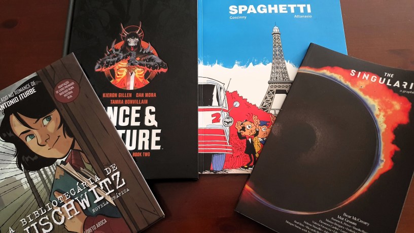 267 – A Bibliotecária de Auschwitz – Salva Rubio e Loreto Aroca – Adaptação do famoso romance (que não li), a história leva-nos a acompanhar a jovem Dita que, tendo origens judaicas, e vivendo na Europa durante a Segunda Guerra Mundial, acaba rapidamente no campo de Auschwitz. A história apresenta, claro, os horrores dos campos de concentração, ainda que, de alguma forma, Dita até tenha uma experiência um pouco mais leve (pelo menos no início). É uma boa adaptação, sem grandes textos entre as imagens, que consegue caracterizar personagens e desenvolve-las;