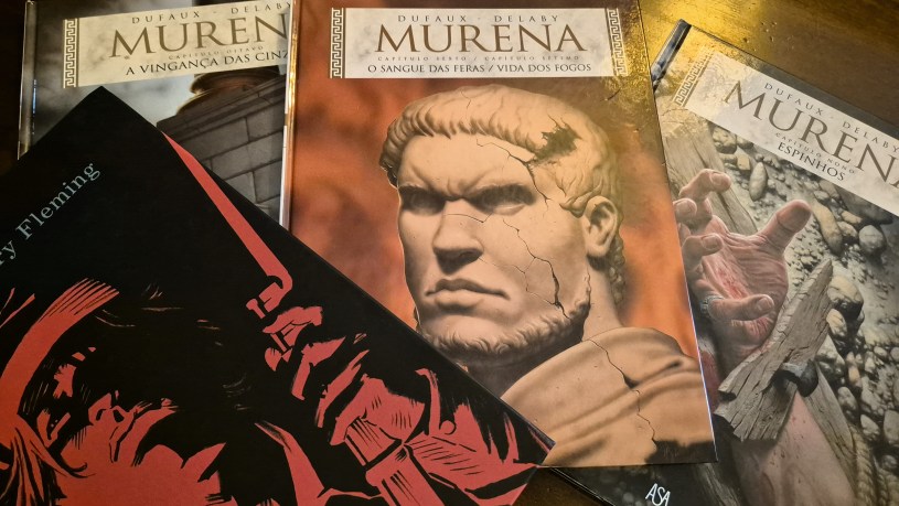 25-27 – Murena – Vol. 6 a 9 – Dufaux – A série prossegue, levando-nos ao Império Romano controlado por Nero, mas focando-se em Murena. Outrora numa posição privilegiada, Murena vê-se ostracizado e perdendo tudo o que valoriza, o que o leva a guardar rancor e procurar vingança. Mas os desenvolvimentos desta mesma vingança irão por em risco a cidade de Roma. Em simultâneo, desenvolvem-se várias tramas políticas, teias de influência por dinheiro e poder. A cidade de contrastes está em ebulição;