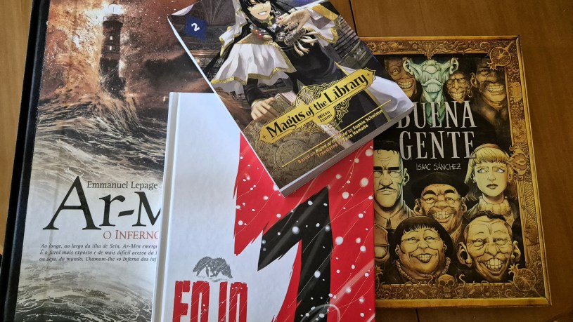 97 – Magus of the Library – Vol. 2 – Mitsu Izumi – A história apresenta agora um Theo mais crescido que faz a longa viagem para a Biblioteca central com o objectivo de ingressar ao seu serviço. A viagem ao longo das várias cidades permite visualizar algumas diferenças culturais, perceber que existe um elevado preconceito para com estrangeiros nalgumas delas, e que o valor dado aos livros vai variando, existindo cidades que esperam ansiosamente pelo próximo volume de uma saga. Este volume termina com Theo a realizar o longo exame, mas sem nos mostrar os resultados;