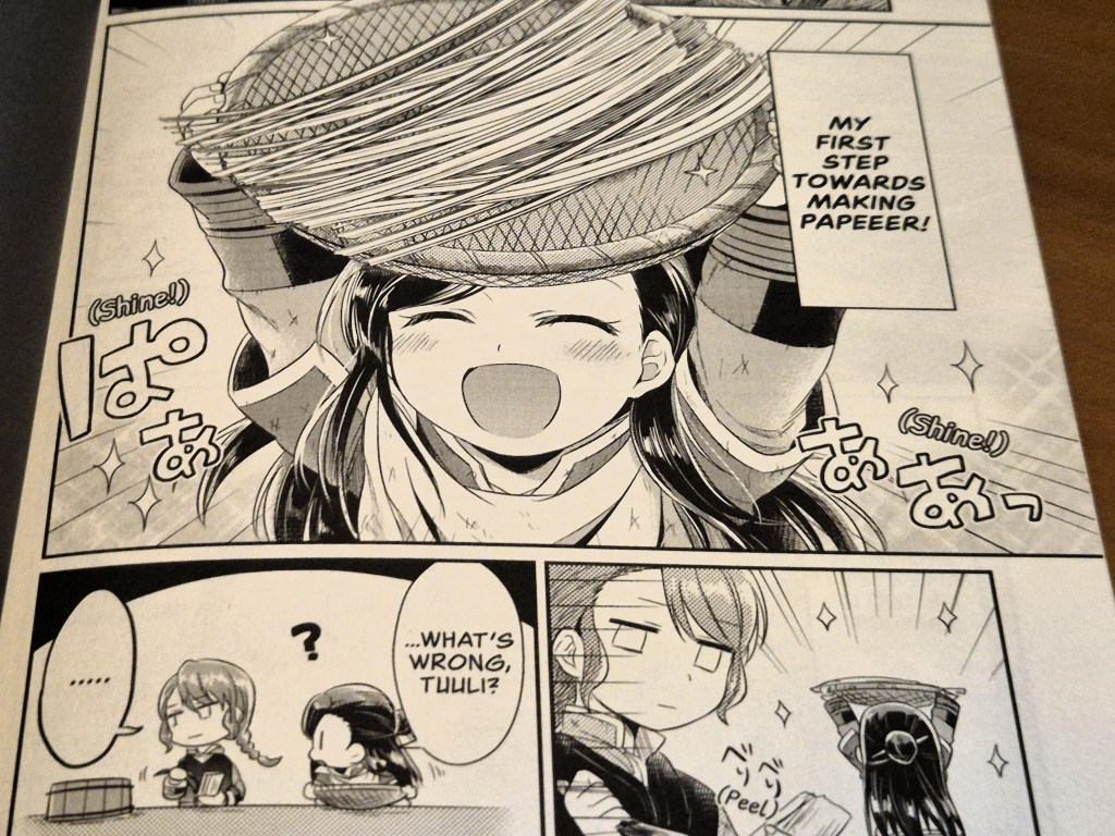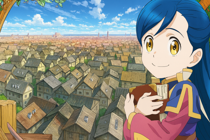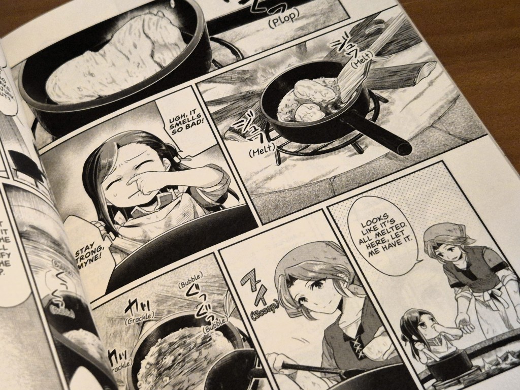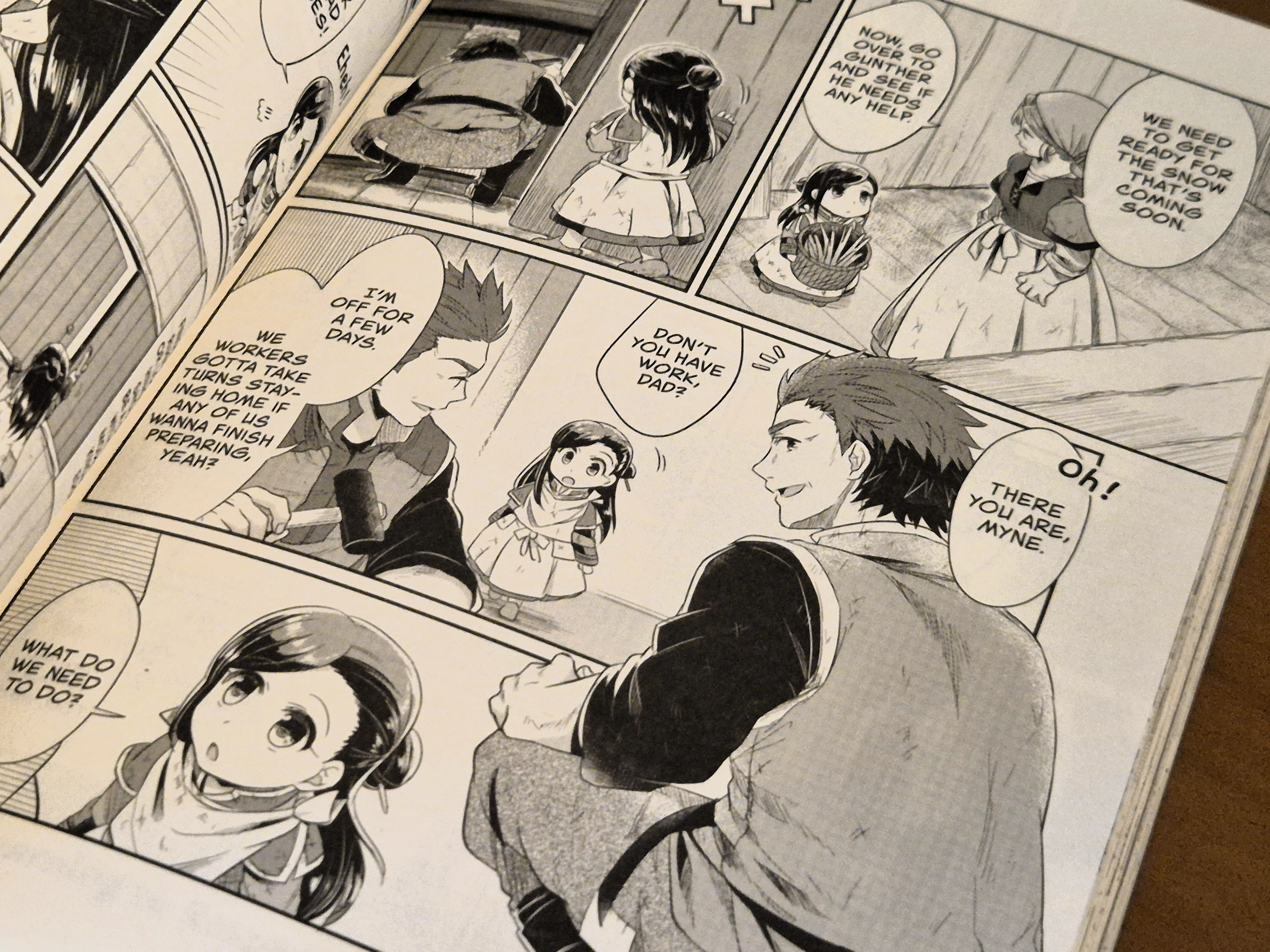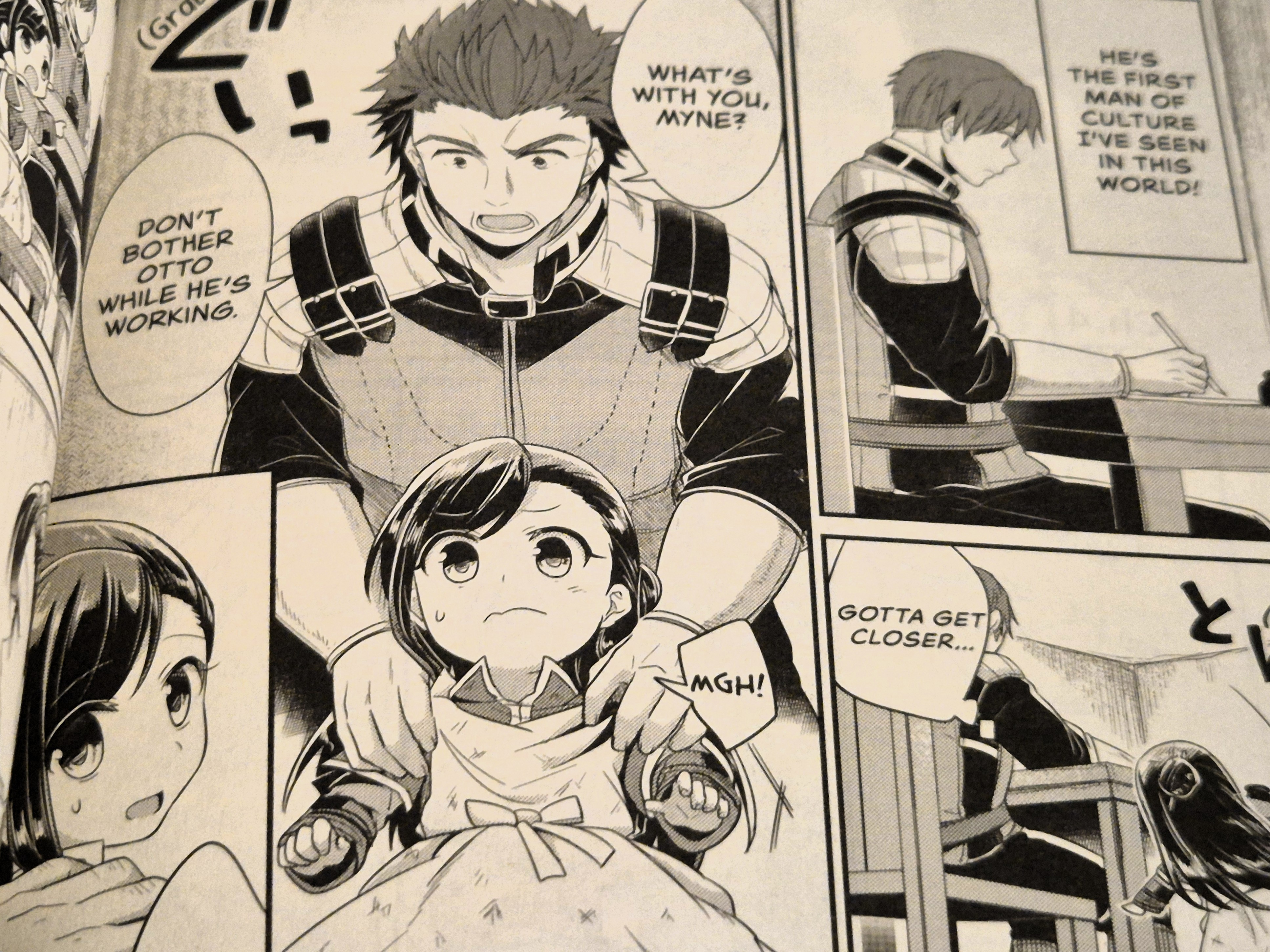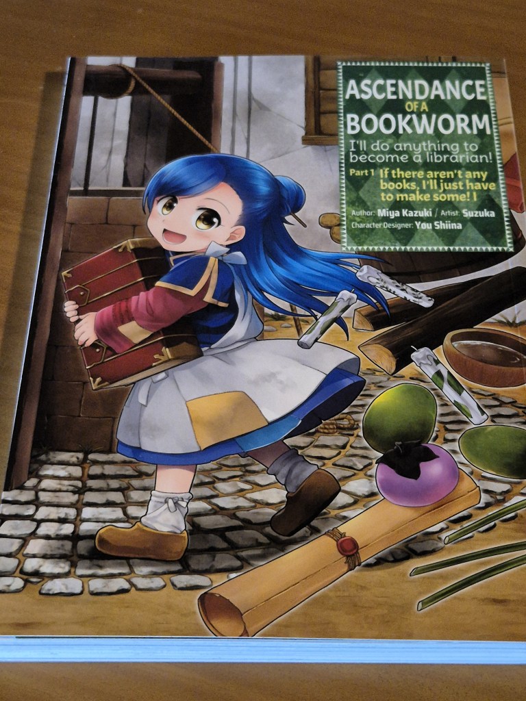 A realidade onde se encontra agora é, aparentemente, feudal. Existem lojas para os nobres (que neste volume apenas são referidas, não sei se serão exploradas mais tarde) e os pobres mantém-se com as compras de alimentos no mercado. Os livros são difíceis de encontrar e poucos sabem ler para além do básico. Mantendo a sua anterior paixão aos livros, a criança decide criá-los ela mesma, usando os materiais que vai encontrando.