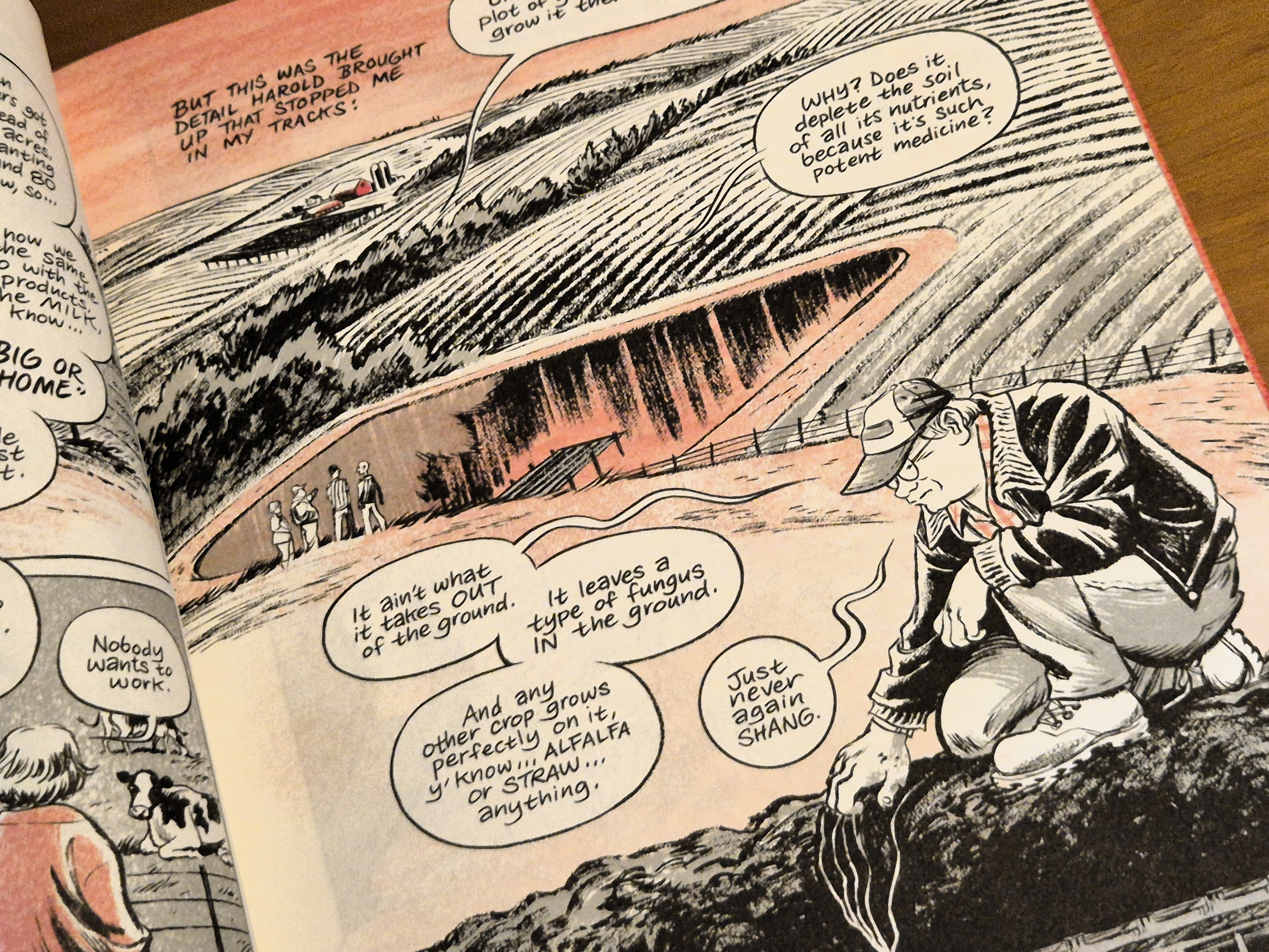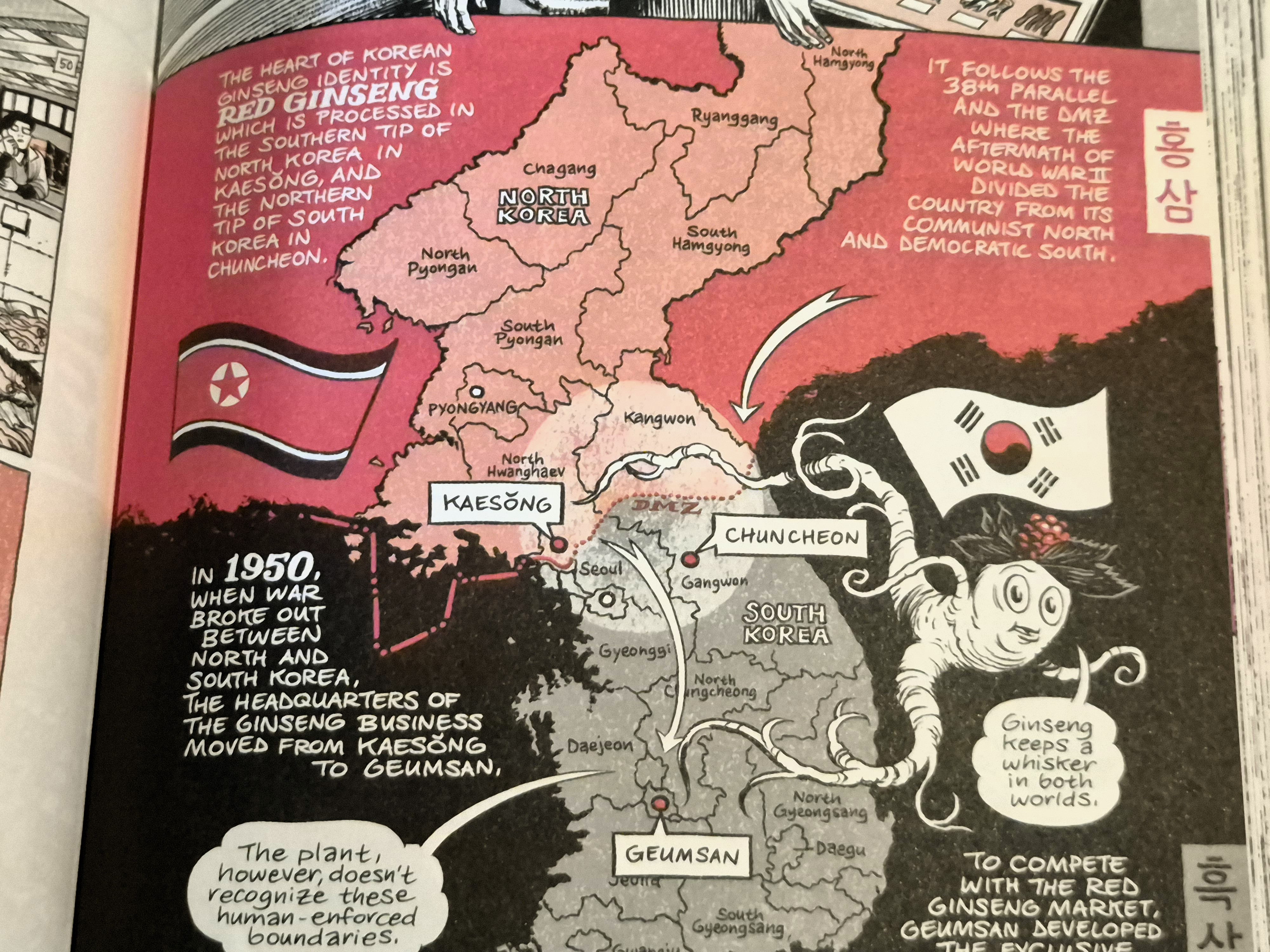 Mas Craig Thompson ultrapassa esta abordagem mais próxima e familiar, obtendo informações e viajando para perceber a história da planta e do seu cultivo. O cultivo da planta tinha obviamente como alvo o mercado asiático, comparando-se os mercados e os produtos produzidos nos dois continentes, com o impacto na economia local – e ainda assim, sendo um produto altamente valorizado na cadeia, pouco faz ganhar os agricultores que nele trabalham e com o cultivo se degradam. Pelo meio ainda se fala da utilização do Ginseng como componente medicinal.
