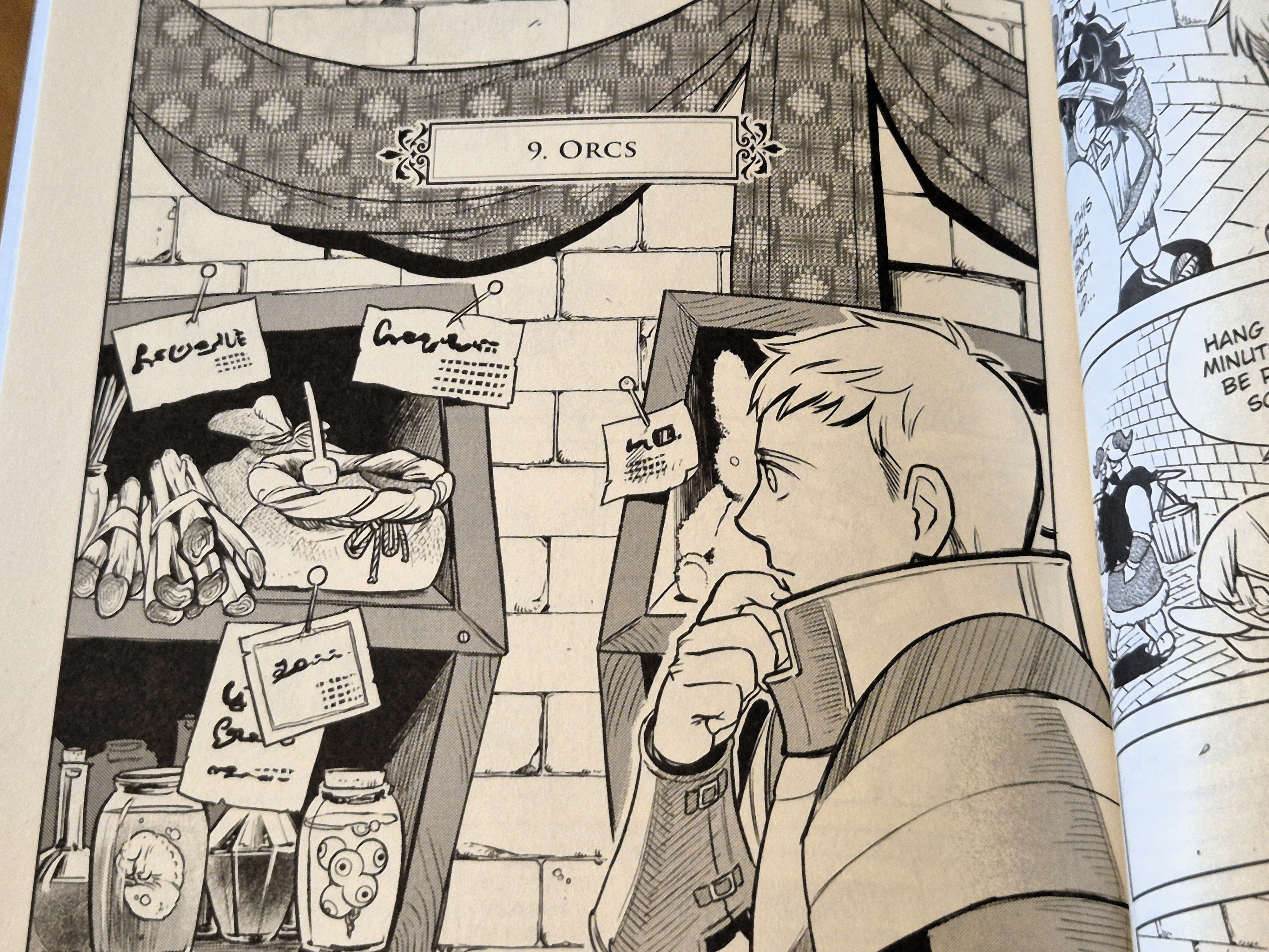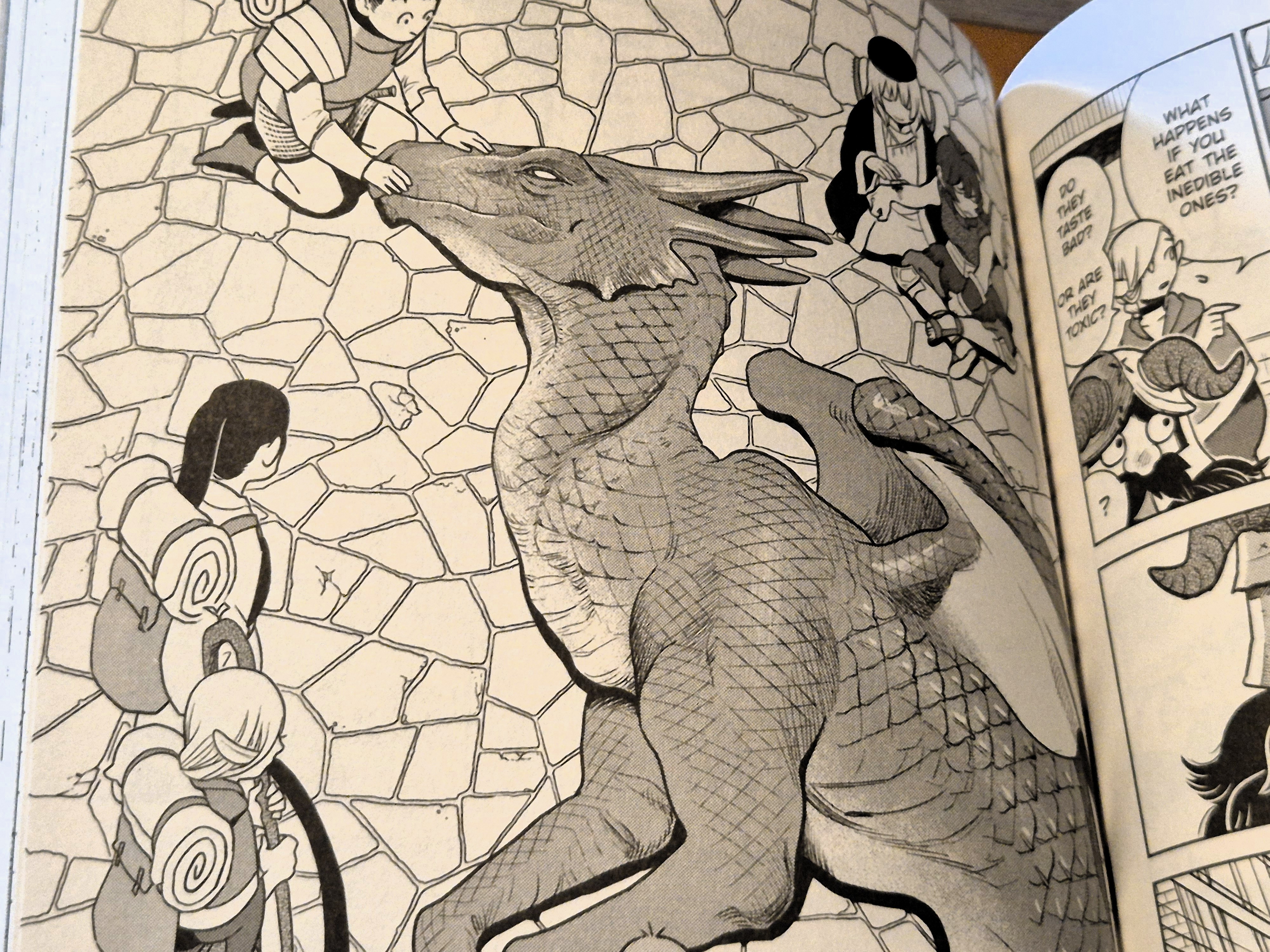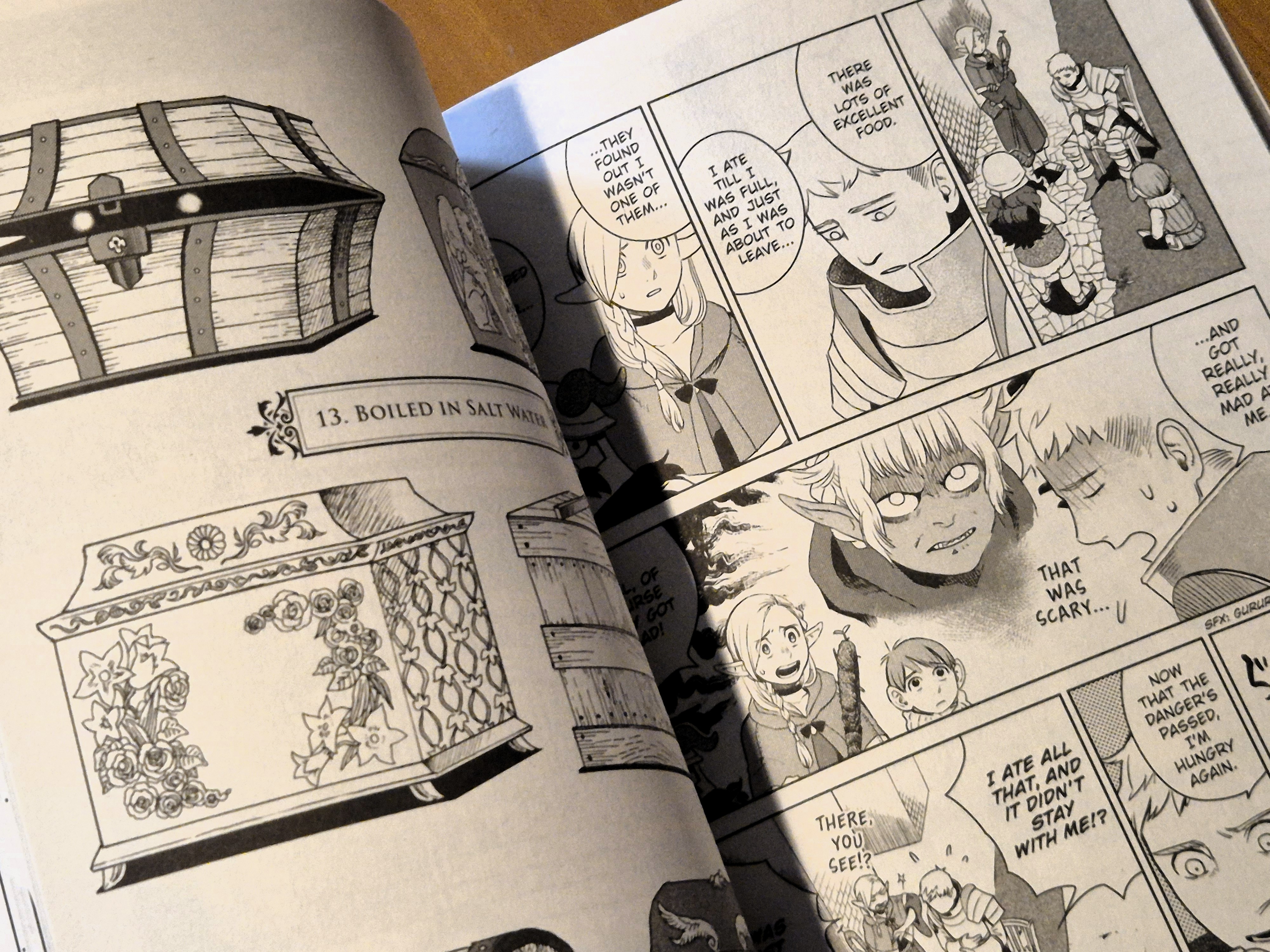 A solução? Ir comendo os monstros que encontram pelo caminho. Ainda que Laios, um dos aventureiros, irmão da que procuram ressuscitar esteja entusiasmado com esta oportunidade, os restantes olham reticentes para o manual de culinária que refere como usar cada monstro, criatura ou planta (ou outro ser não qualificável). Felizmente, ao grupo junta-se um anão que vive há longos anos na masmorra e que se habituou a preparar as diferentes criaturas.