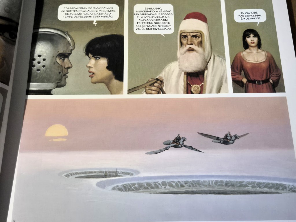 Se inicialmente, apesar de ter apreciado, achei a série O Mercenário um pouco datada, com posturas rígidas e expressões fixas e exageradas, com a progressão, o interesse tem aumentado, sobretudo pelo mundo construído, pelos elementos surpreendentes que vão aparecendo na narrativa. Esta diferença de interesse reflecte-se sobretudo pela velocidade com que pego no próximo volume, assim que é lançado. Os mais recentes volumes merecem bem este foco, principalmente o último que foi o que gostei mais.
