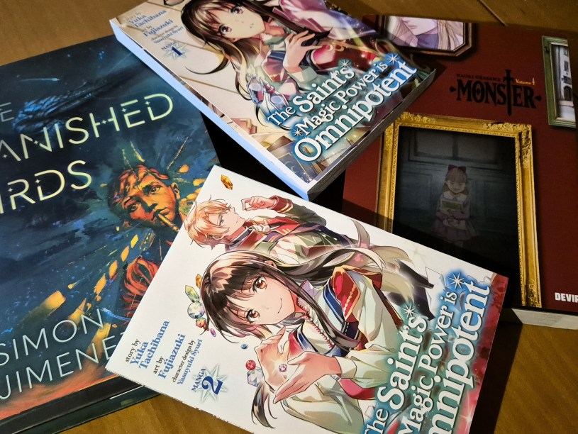 26 / 27 – The Saint’s Omnipotent Magic Powers – Vol. 1 e 2 – Yuka Tachibana – Esta série começa como a The Ascendance of a Bookworm, em que uma jovem se vê repentinamente num mundo diferente. O fenómeno não será novo no mundo a que chega, existindo uma aura mágica que causas monstros que devem ser combatidos. Neste seguimento, convocam-se pessoas que são transferidas para aquele mundo e que poderão ter uma carga mágica que controla o aparecimento de monstros. A série começa de forma tosca, e apesar de ser menos envolvente que outras que estou a seguir, tem-me interessado o suficiente para continuar lentamente a leitura. Neste mundo a jovem transforma-se num género de farmacéutica, num instituto científico, percebendo-se rapidamente que os produtos que cria são muito mais eficazes do que os dos seus colegas. As suas capacidades não se ficam por aqui.